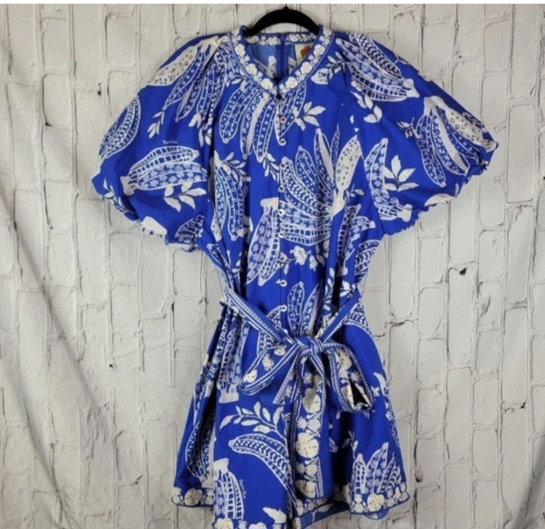 Farm Rio Blue Banana Print Romper Belt Balloon Short Sleeve V-Neck Missing BELT