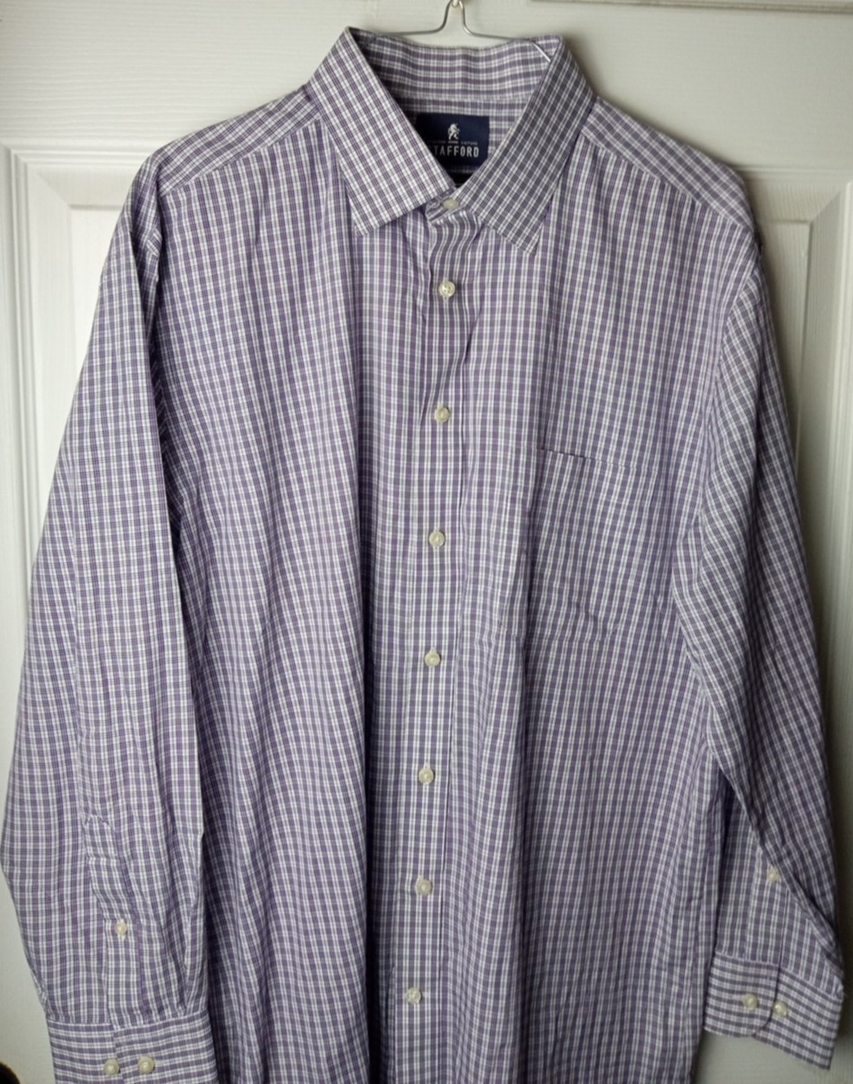 как выглядит Stafford Fitted Shirt Mens 16 1/2 Purple White Plaid Long Sleeve Button Up фото
