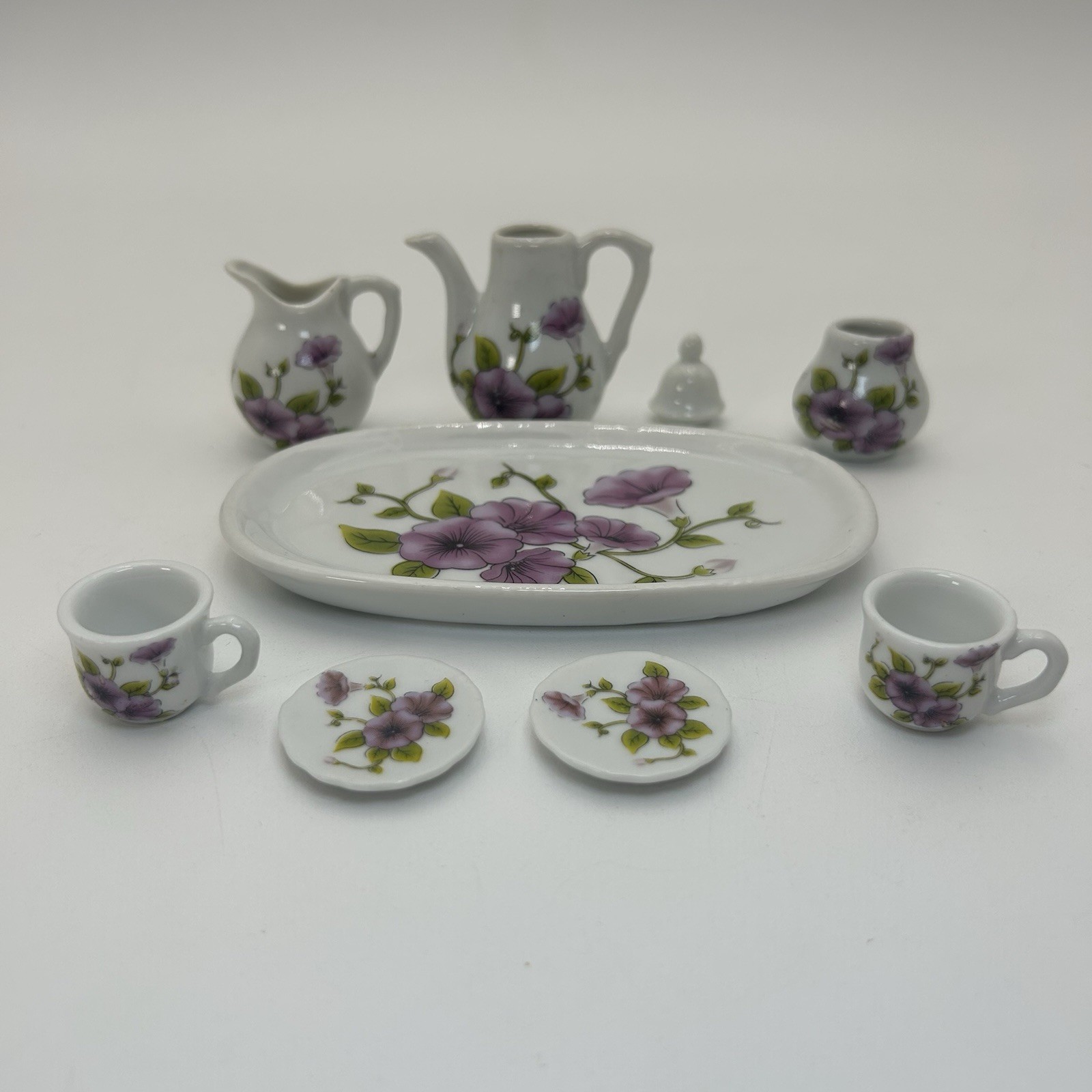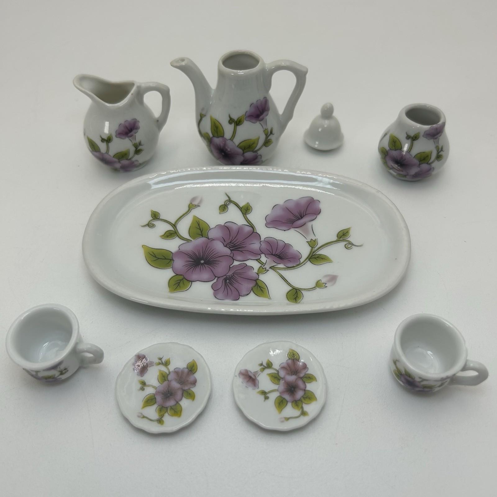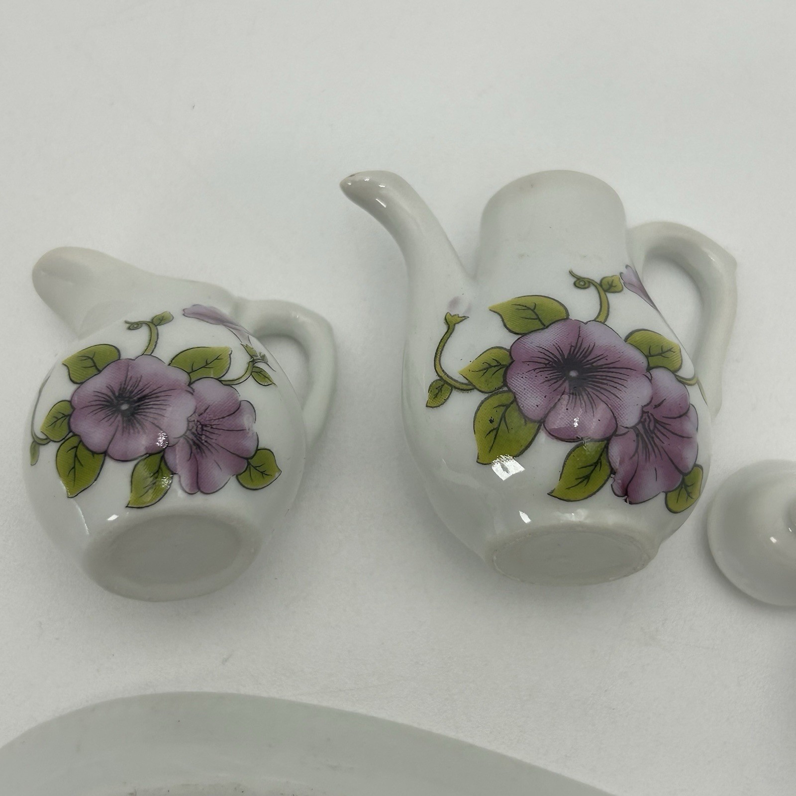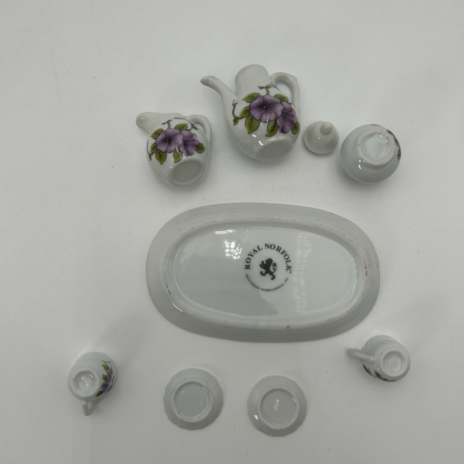 Royal Norfolk Mini Porcelain Tea Set 9 Piece with Purple Flower Dollhouse Pot