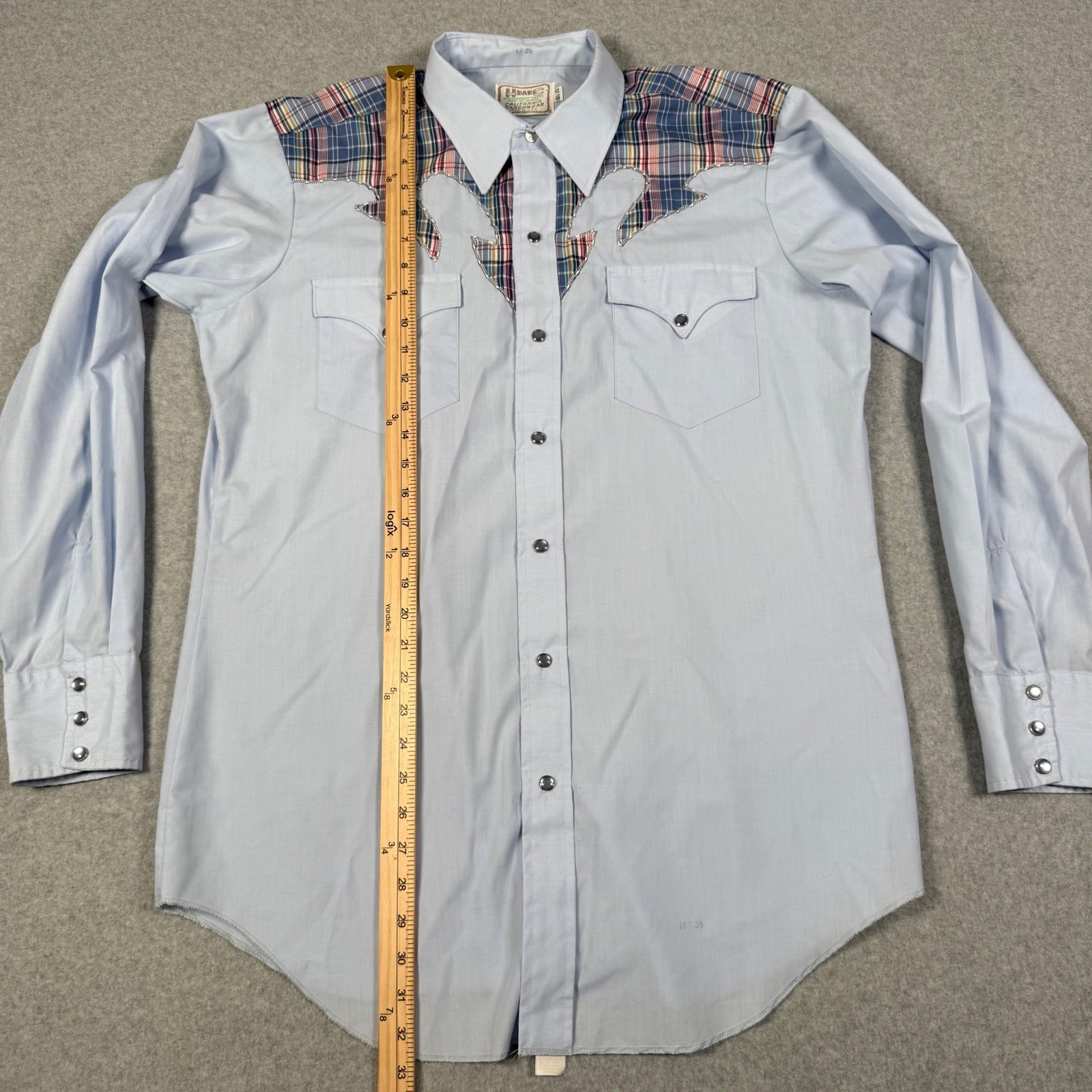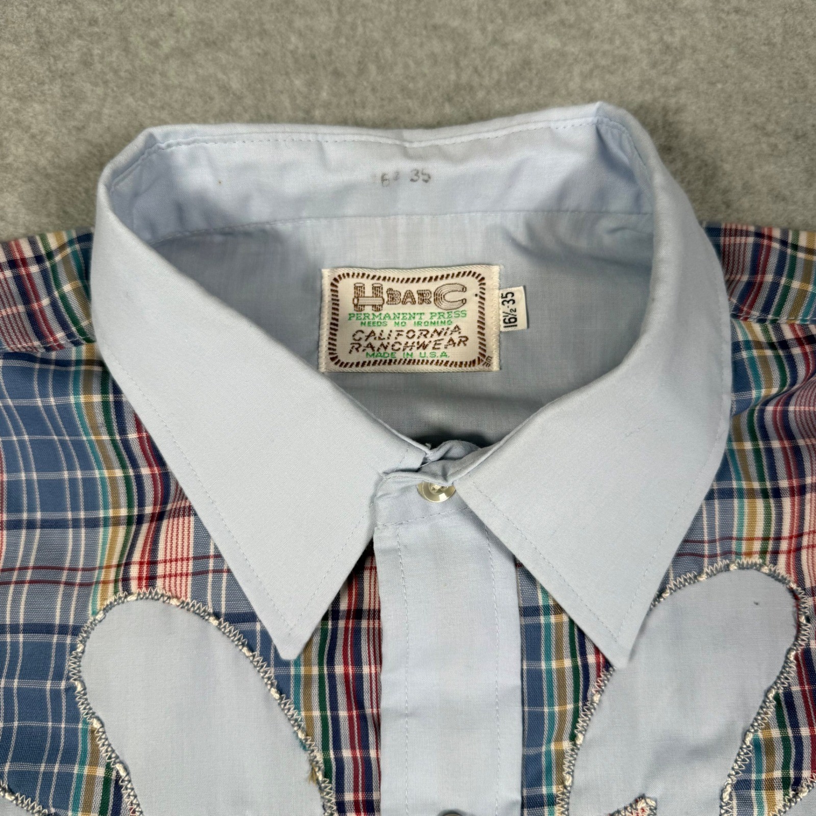 H Bar C California Ranchwear Vintage Western Pearl Snap Shirt Blue Plaid 16.5x35