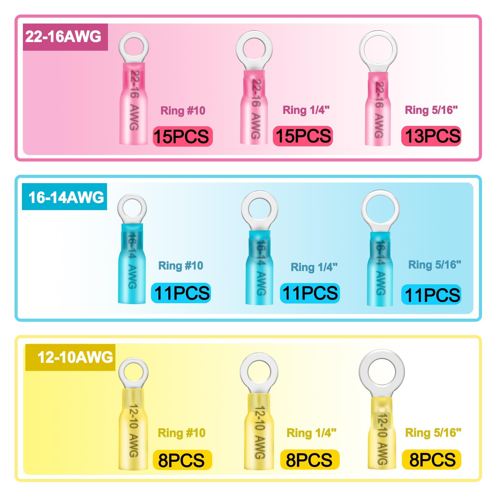 Included Components: 100Pcs Heat Shrink Ring Connectors #10,1/4",5/16"(3Colors/9Sizes)