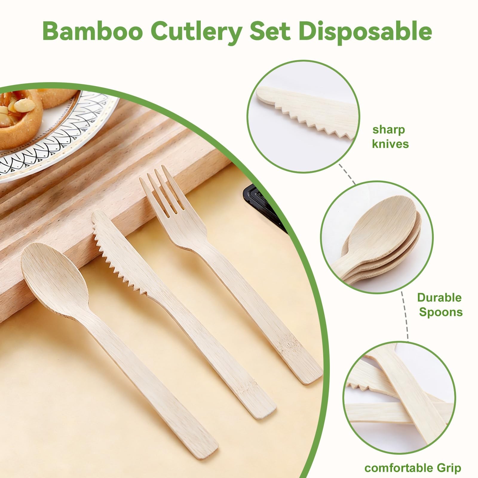 100 Bamboo Cutlery Set Disposable Compostable Utensils With Forks, Spoons An...