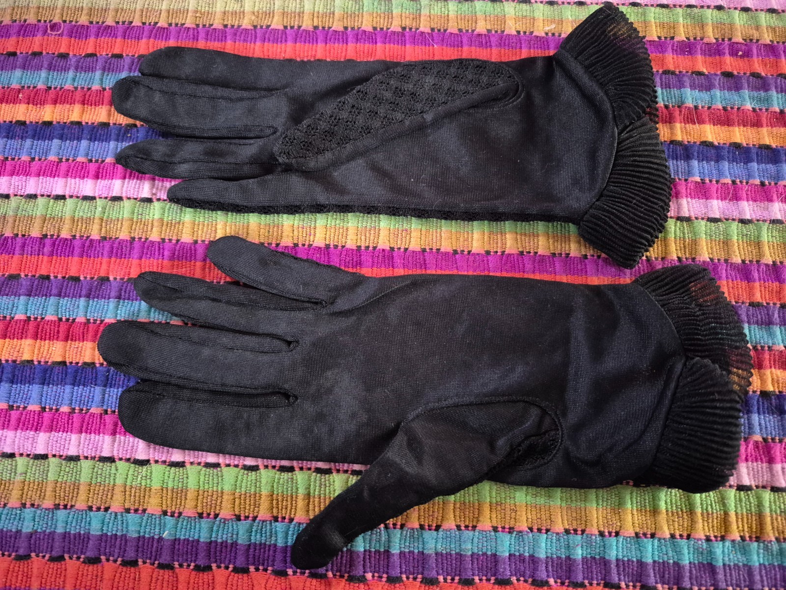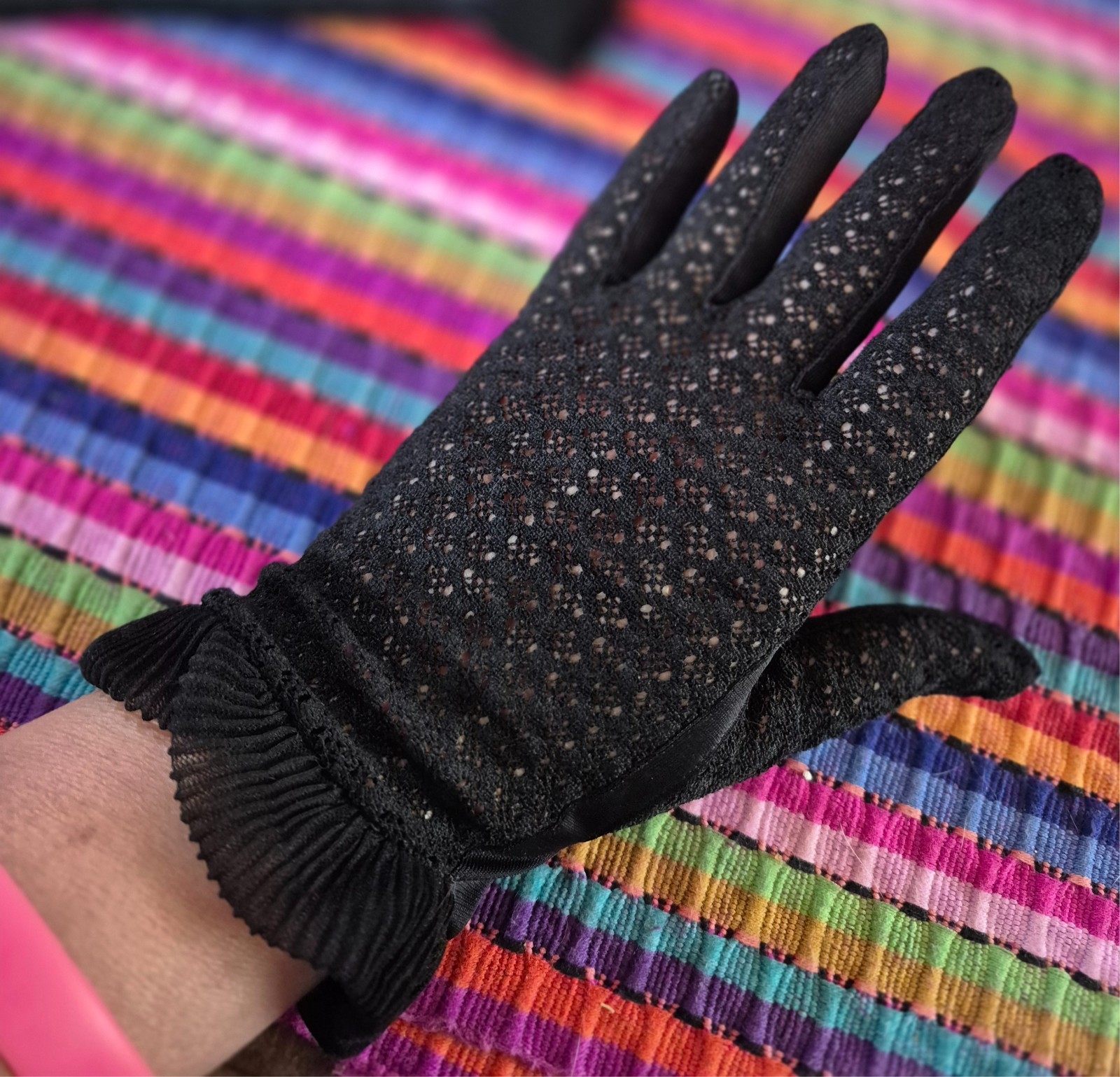 Vintage Black Gloves Short Open Weave Pattern Ruffled Cuffs Excellent Cond 198
