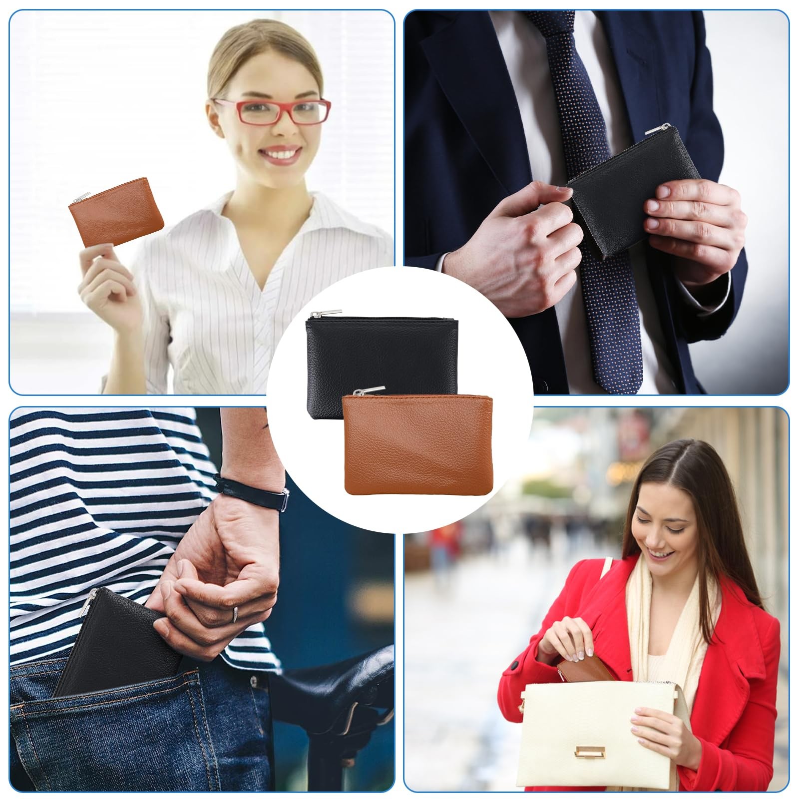 2 Pack Leather Zipper Coin Purse, Portable 12cm 8cm/4.72n 3.15in, Black Brown