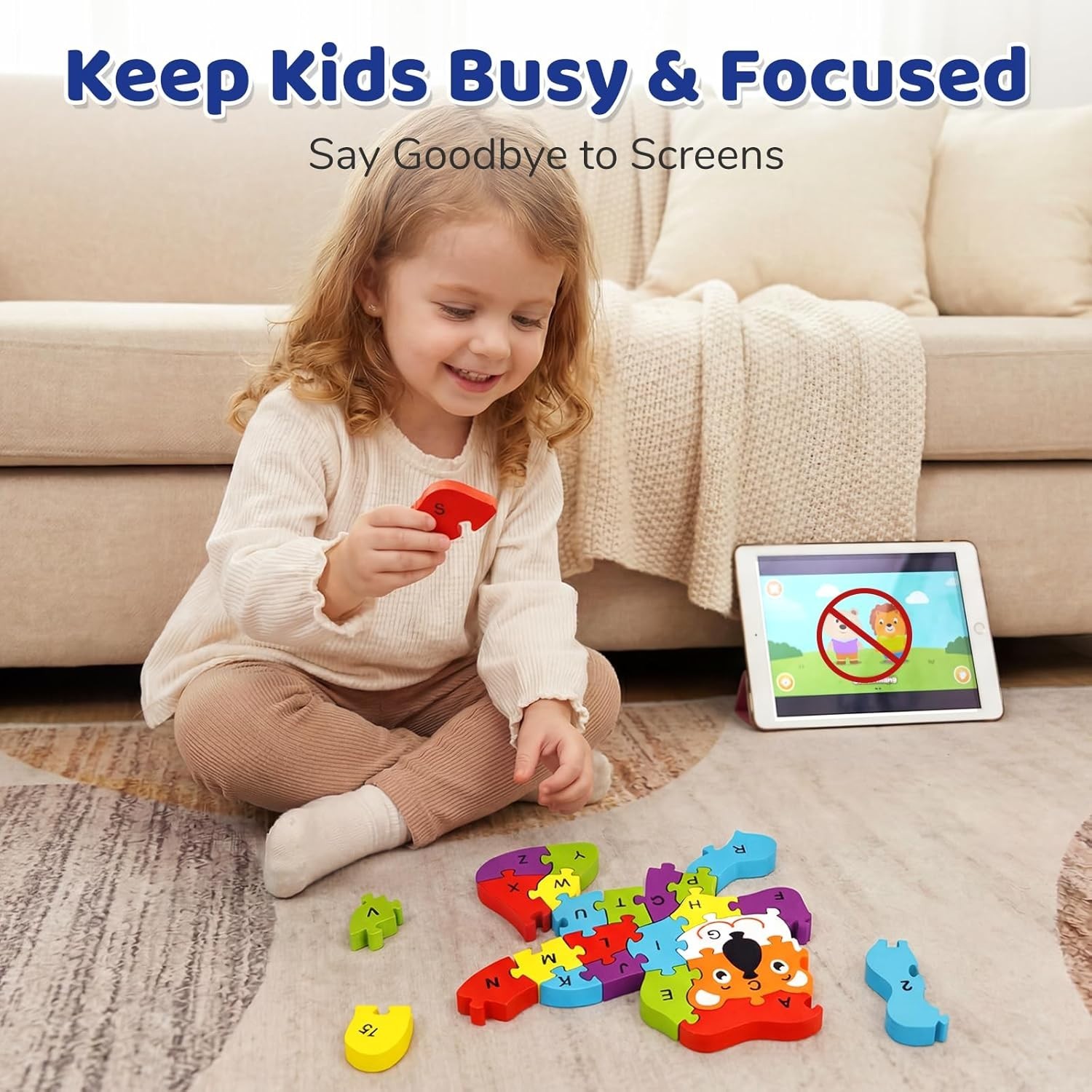 Wooden Puzzles for Kids, Double Sided Lion Jigsaw with Alphabet Numbers, Mo...