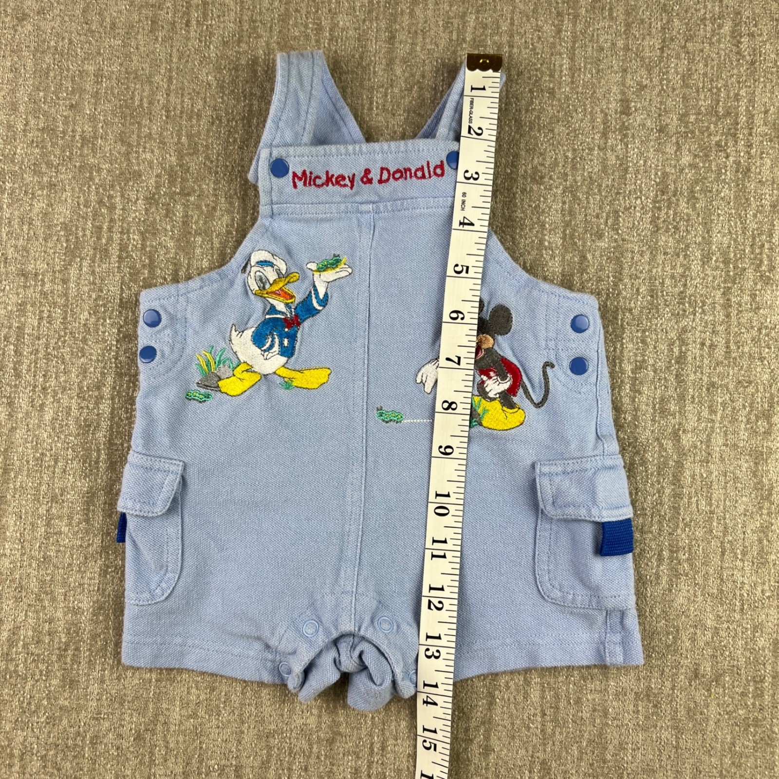 Vintage Disney Mickey Donald Shortall Romper Baby 0-3M Blue Embroidered Snaps