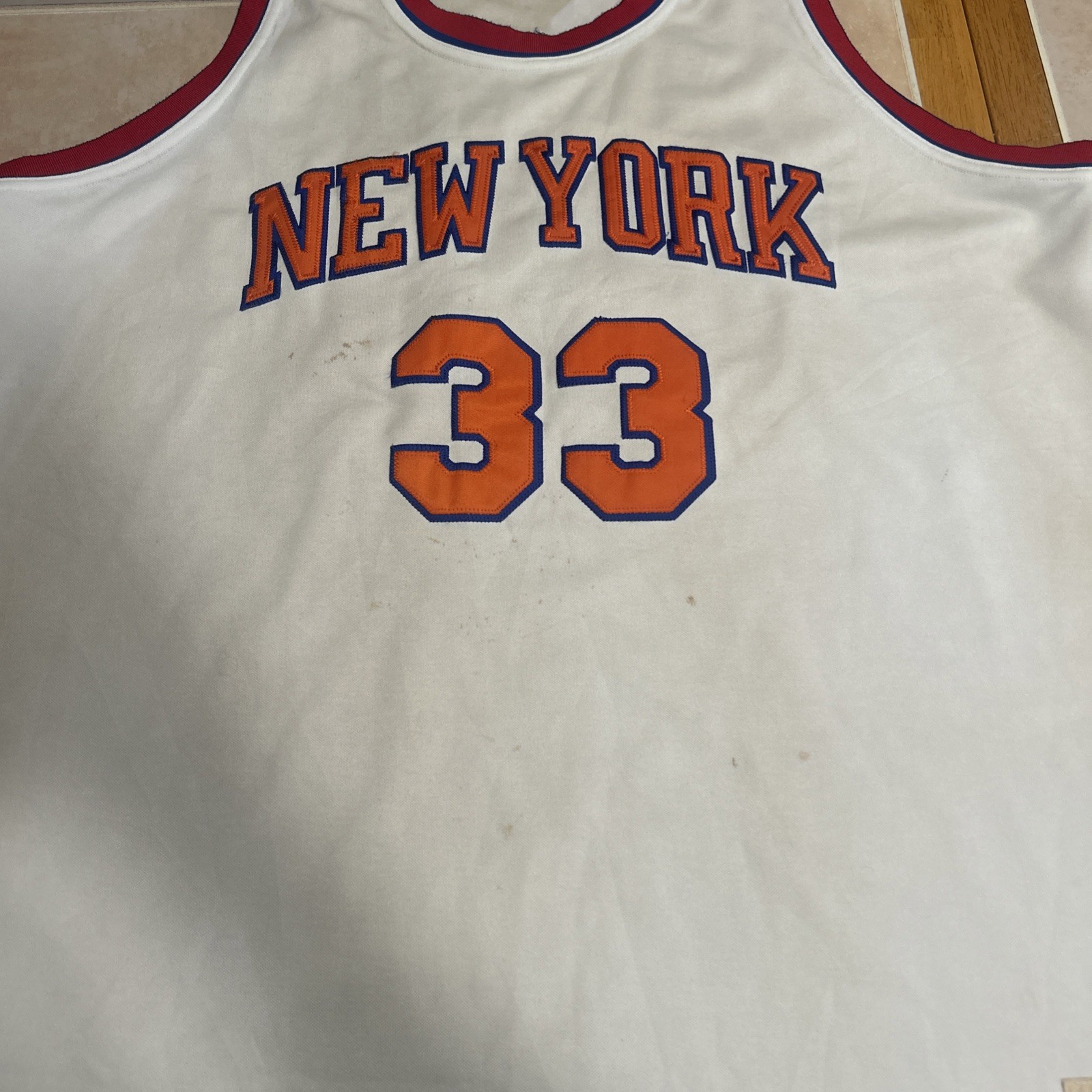 как выглядит Men s 2x Patrick Ewing Mitchell And Ness Jersey 1985-86 White With Staining фото
