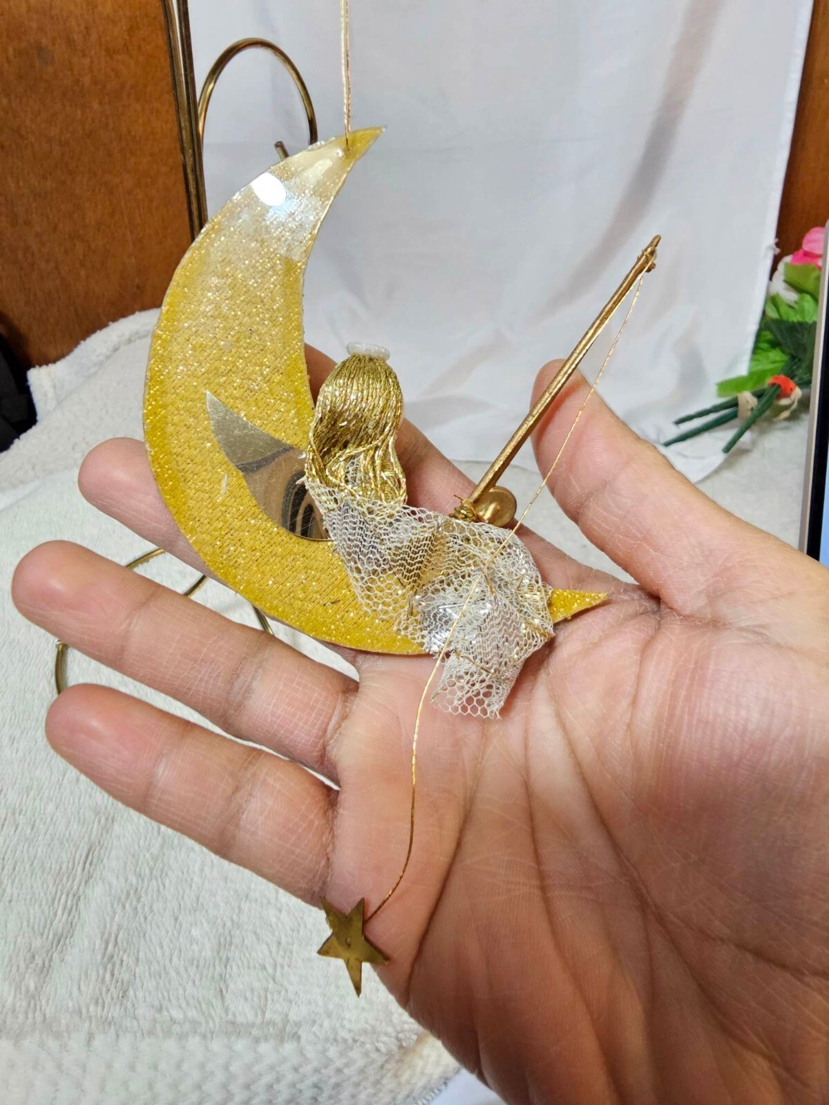 как выглядит Vtg Angel in crescent moon star christmas Ornament Composite gold color фото