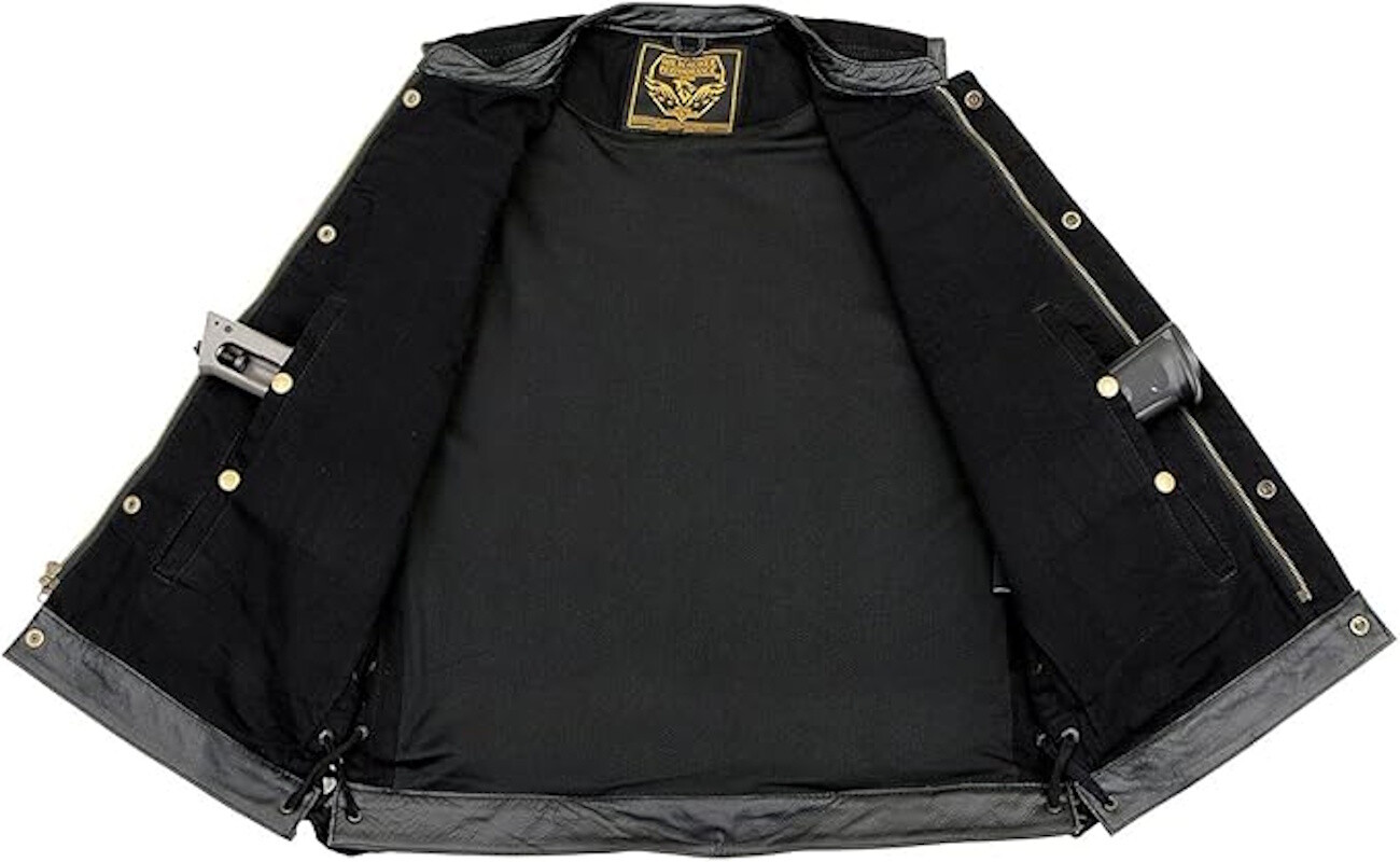 MENS MOTORCYCLE DENIM VEST w/ LEATHER TRIMS LACES DUAL CONCEAL GUN POCKETS -SADI