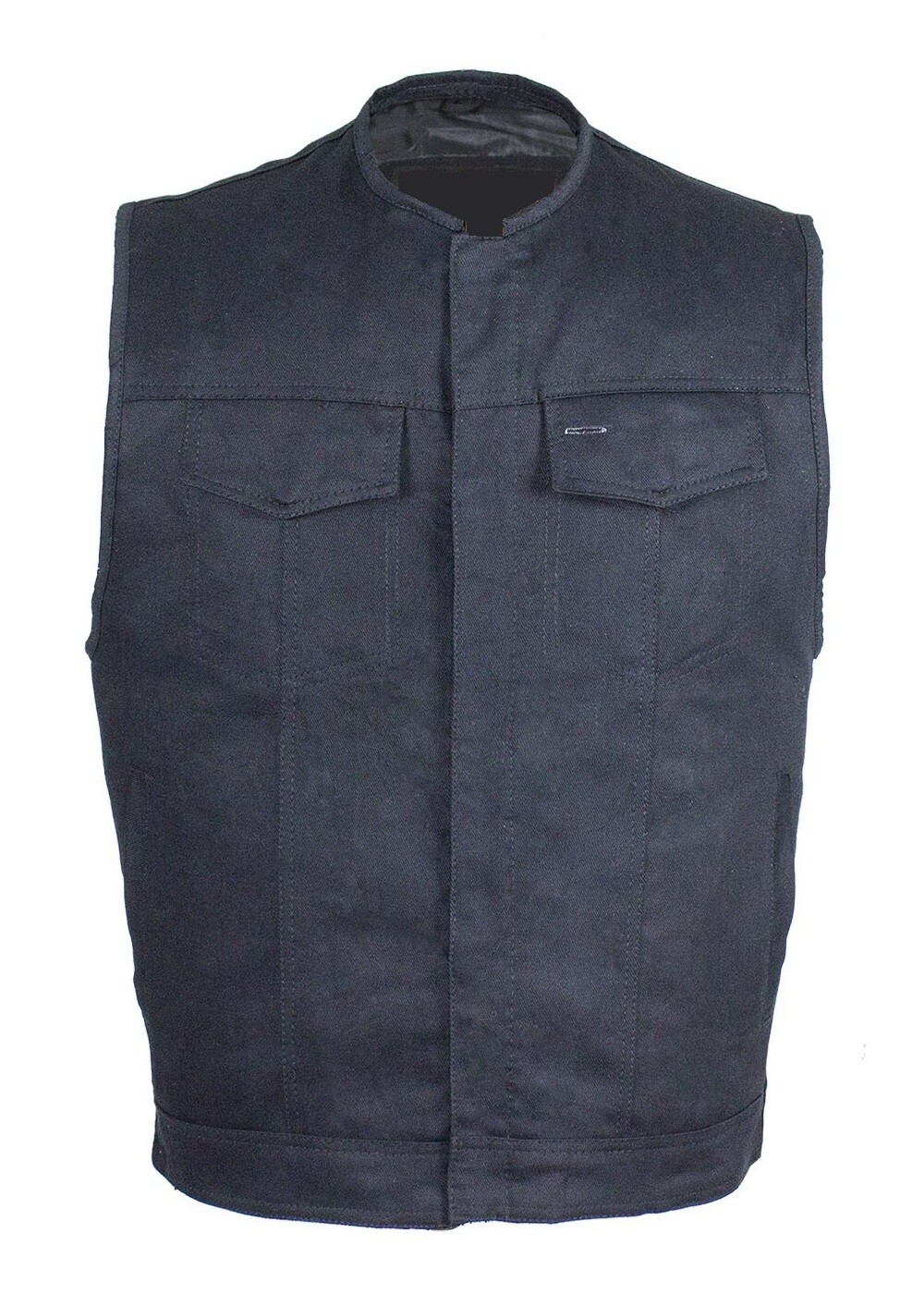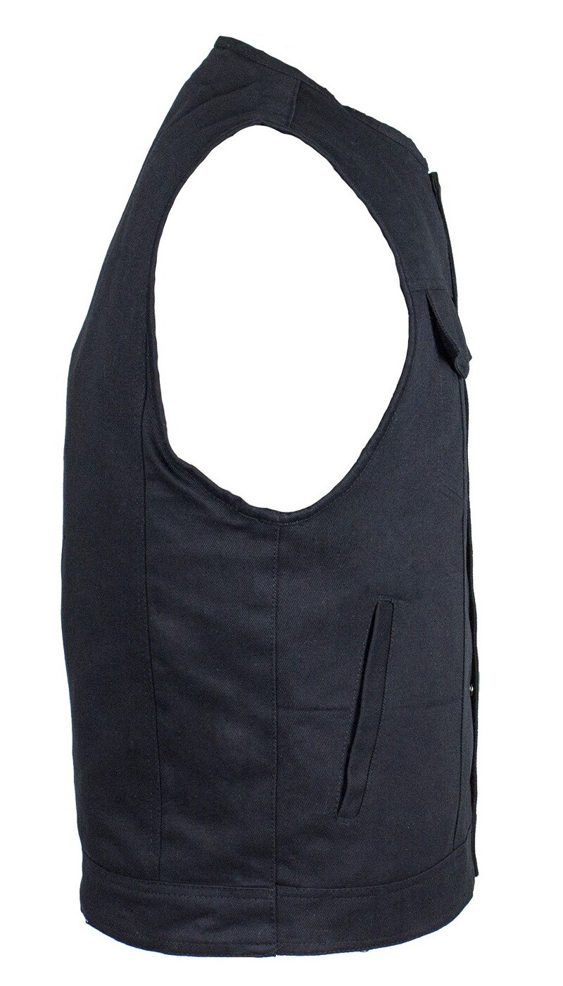 MENS MOTORCYCLE BLACK DENIM COLLARLESS VEST w / CONCEAL CARRY POCKETS ZIP- K3B