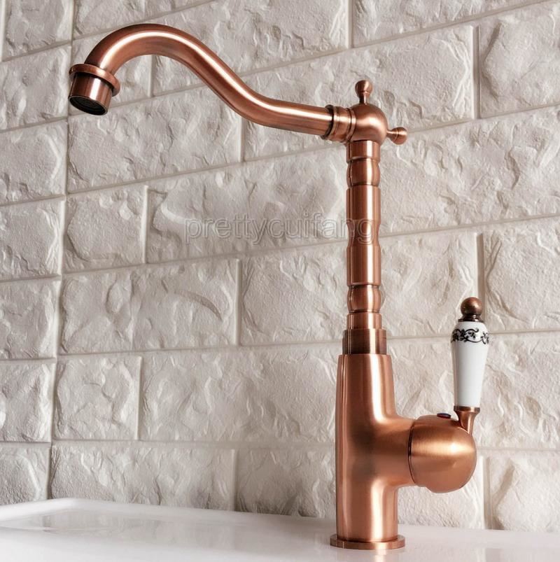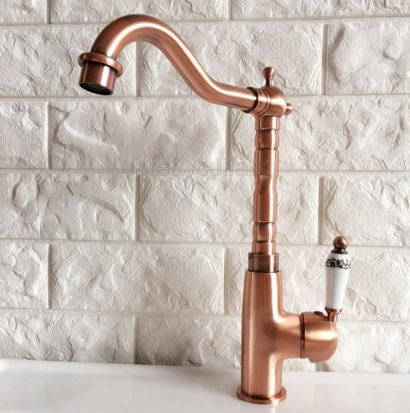 Antique Red Copper Ceramics Handles Swivel Kitchen Sink Mixer Faucet Tap Pnf416