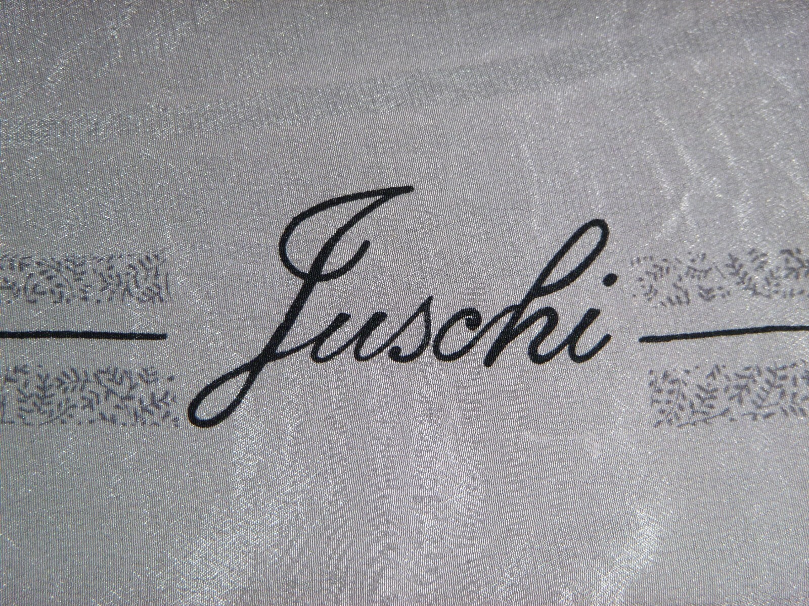 Vtg 70s Juschi Square Silk Scarf Hand Rolled Grey Gray W/ Black Logo Leaves
