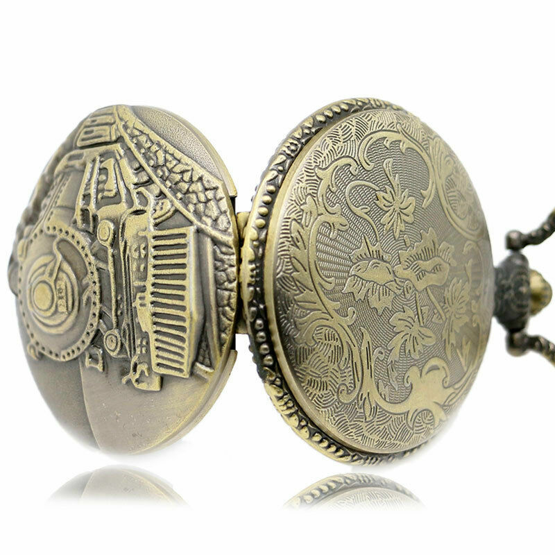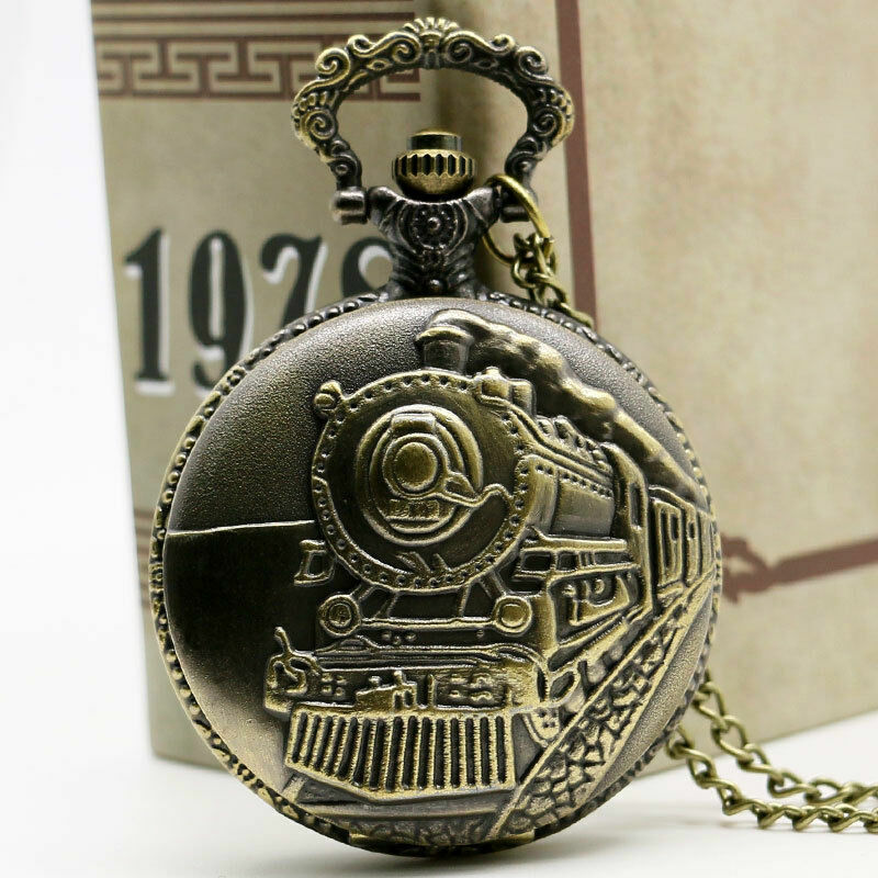 Retro Bronze Steam Train Unisex Analog Quartz Small Pocket Watch Neckalce Chain