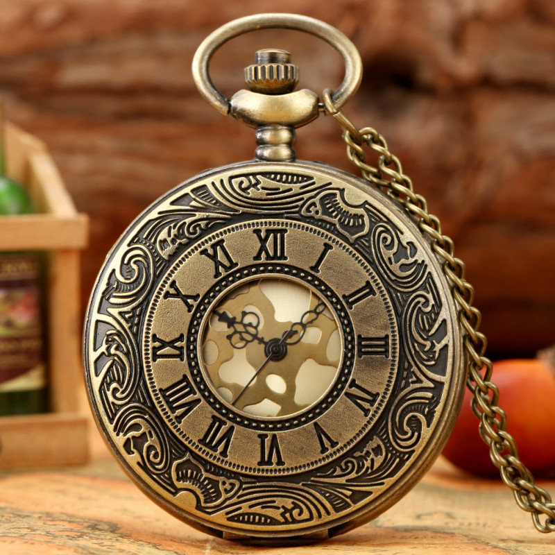 Steampunk Carving Roman Number Case Unisex Quartz Pocket Watch Pendant Chain