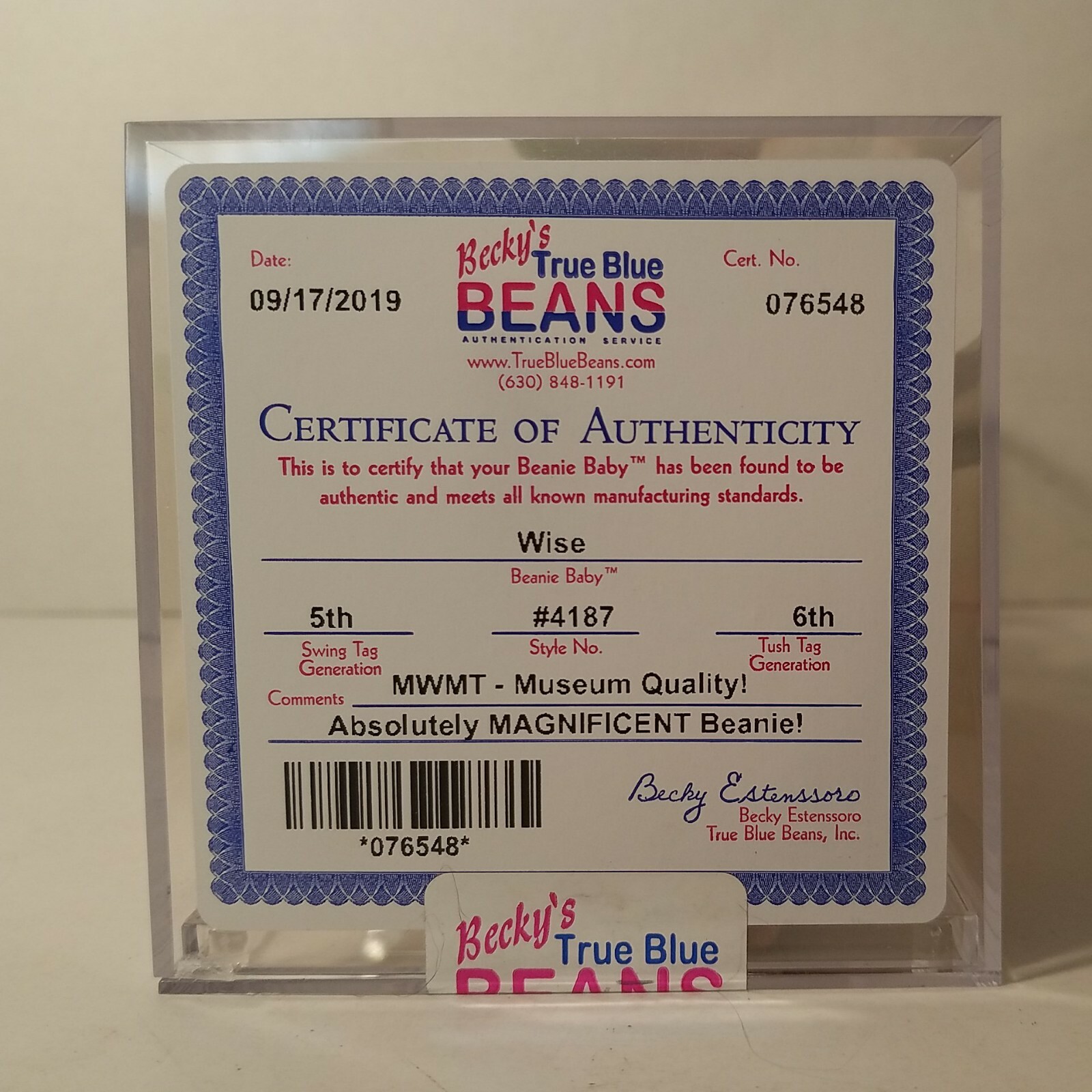 Ty Beanie Baby Wise W/ COA Museum Quality; Swing Tag 5th Tush Tag 6th