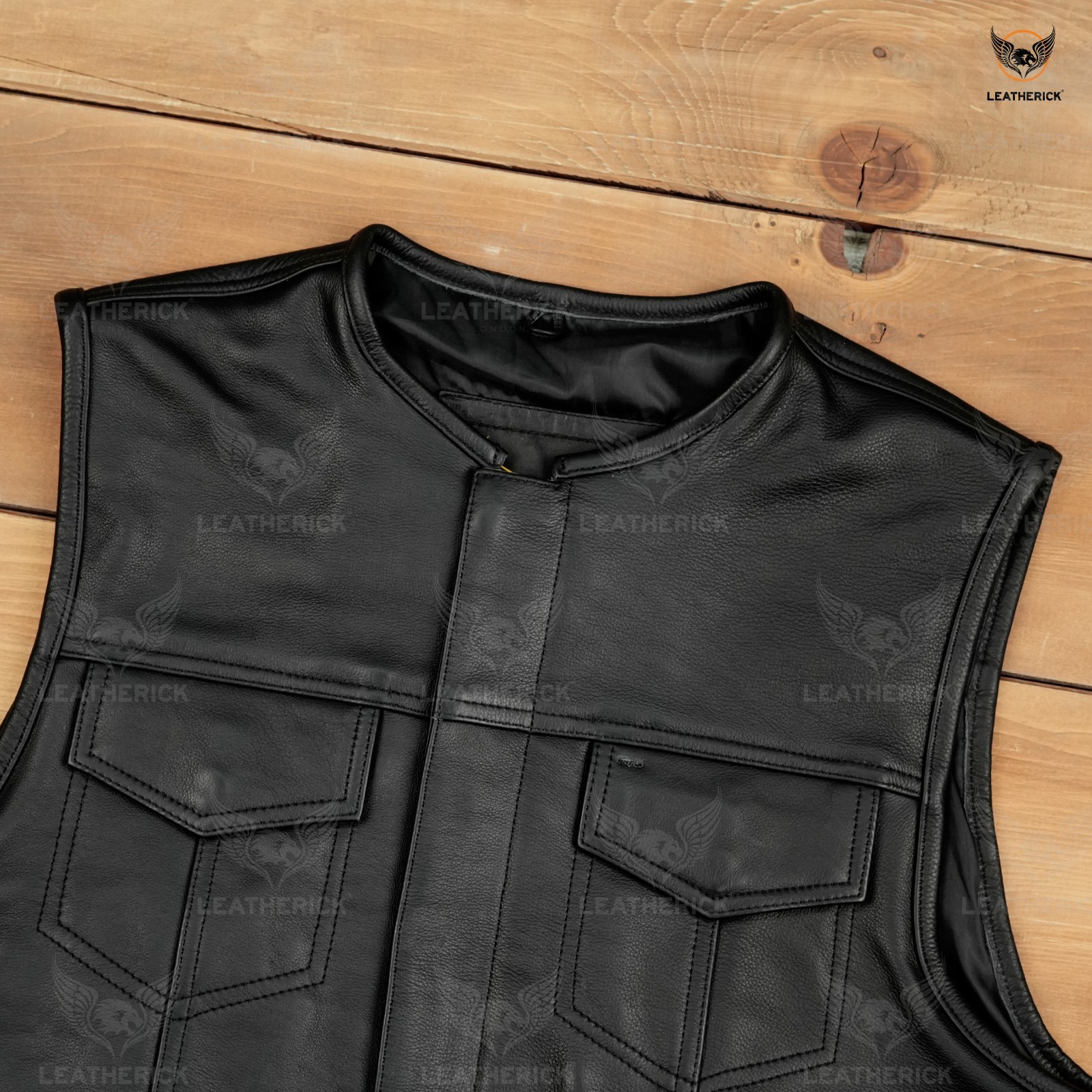 Men's SOA Collarless Leather Vest Motorcycle Biker Club Concealed Carry Outlaws