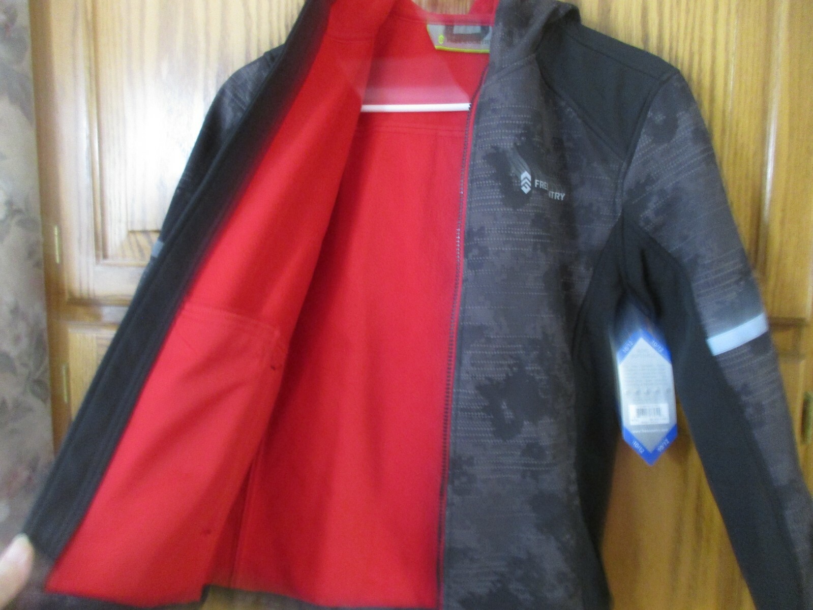 как выглядит Boys Black Gray Camo With Red Lining Free Country Hooded Softshell Jacket 10/12 фото