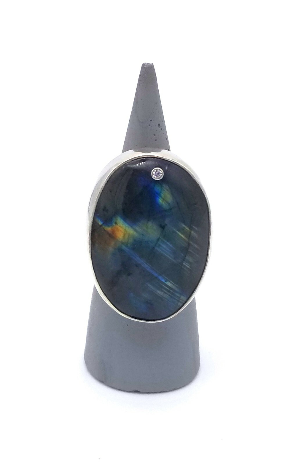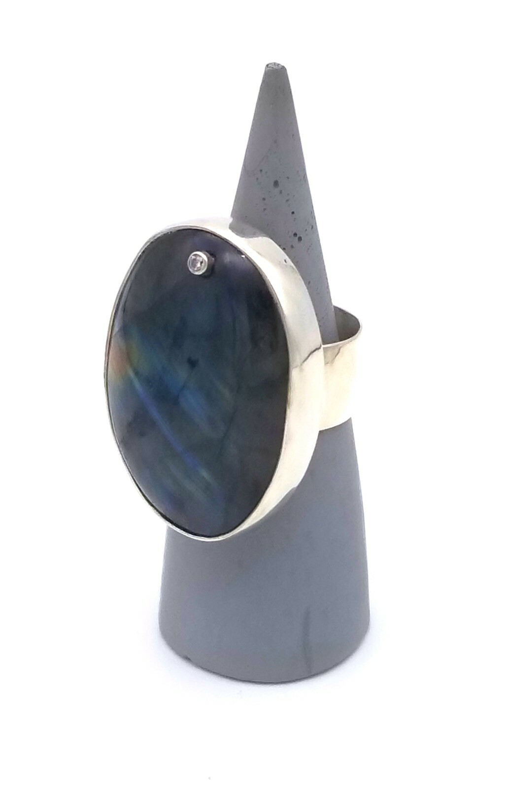 Sterling Silver Bezel Set Labradorite Ring With Cubic Zirconia Accent Handmade