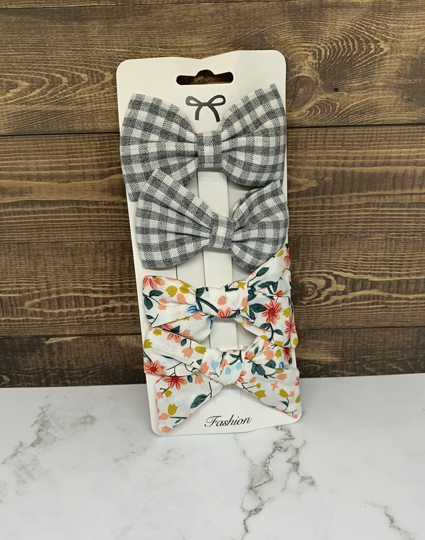 Little Girl Fabric Hair bows set of 4 with covered clips, Floral Gray Plaid