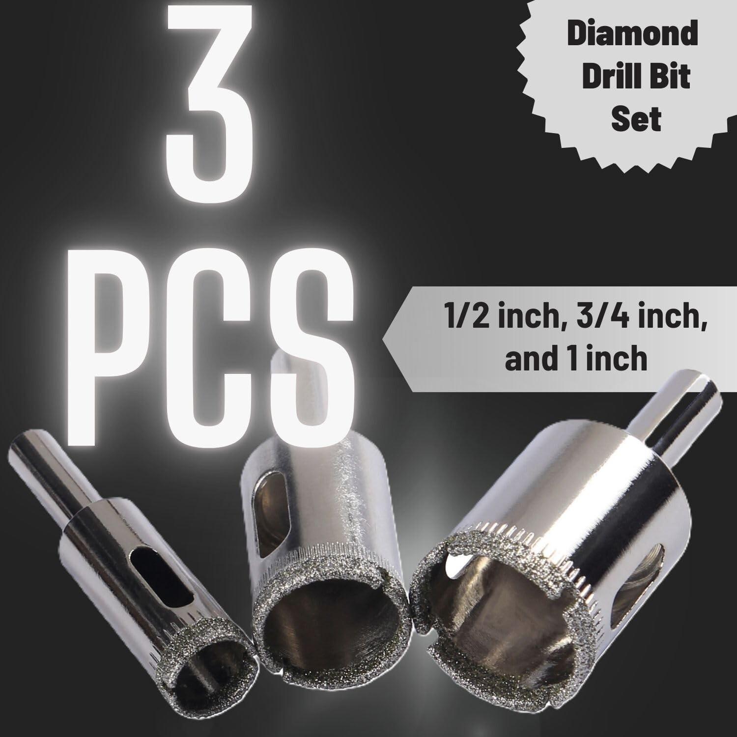 3 PCS Diamond Drill Bit Set 1/2, 3/4 , 1 inch Glass Drill Bit Porcelain Tiles