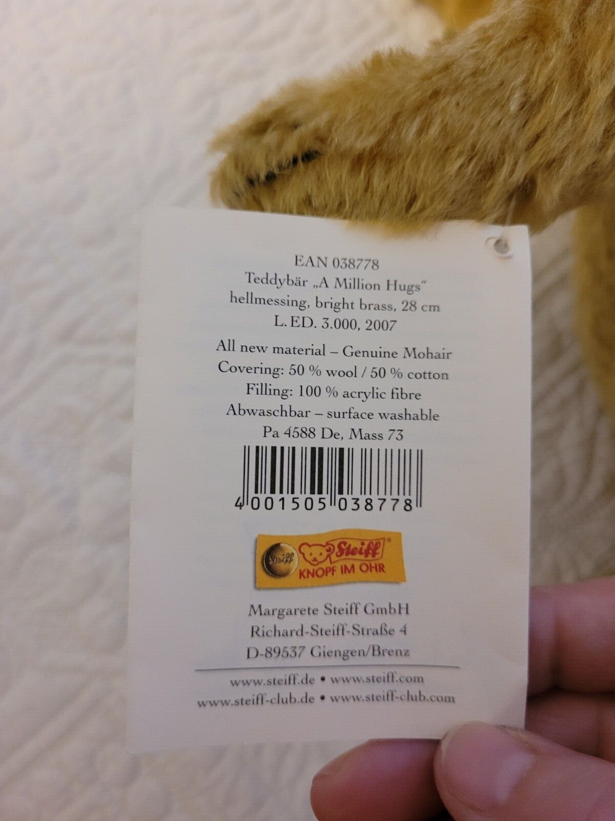 Steiff Bear- Limited Edition A Million Hugs 1907-2007Anniversary Bear