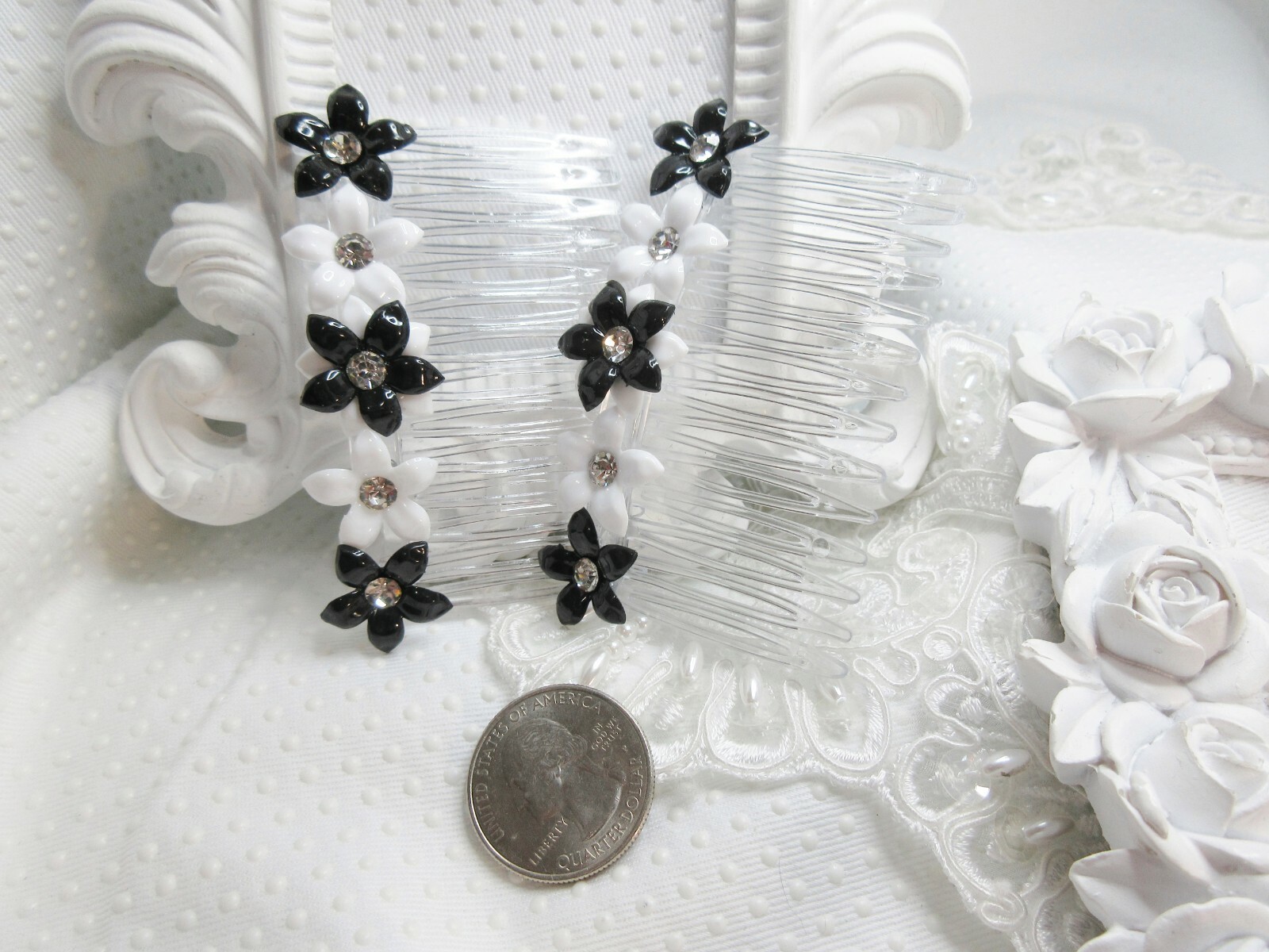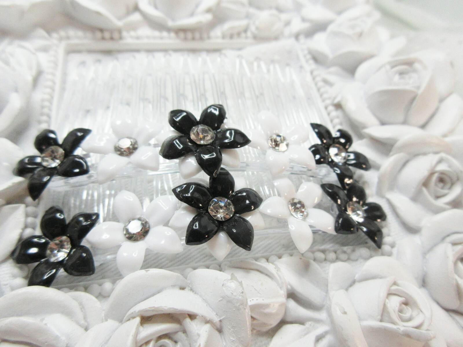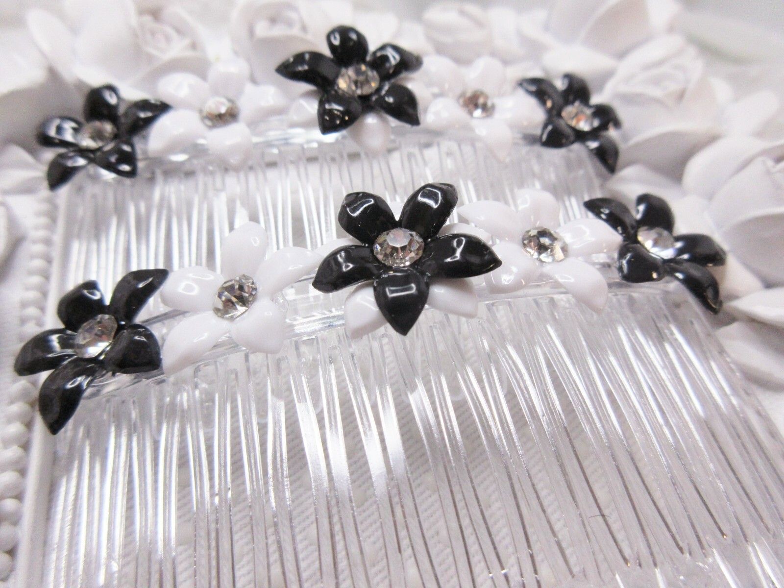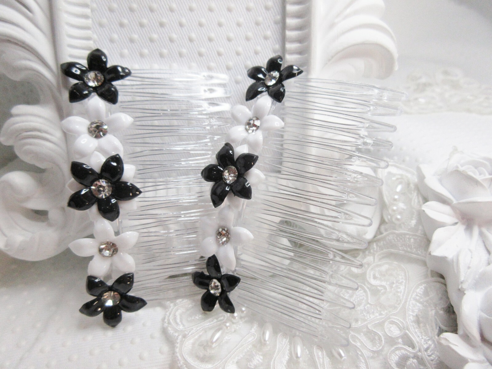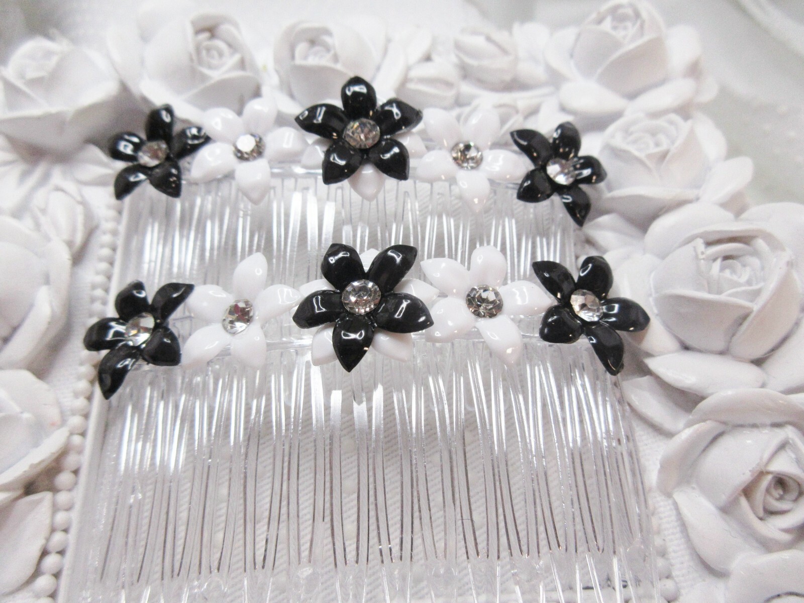 Black and White Lucite floral side hair combs with Vintage 1960's Crystals