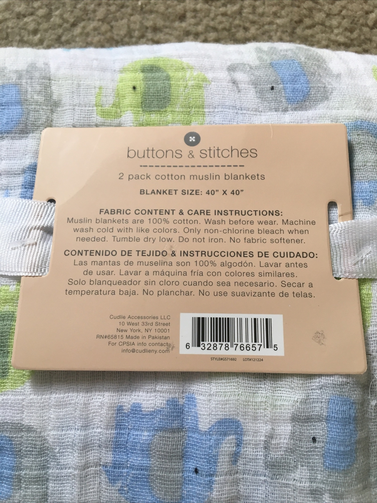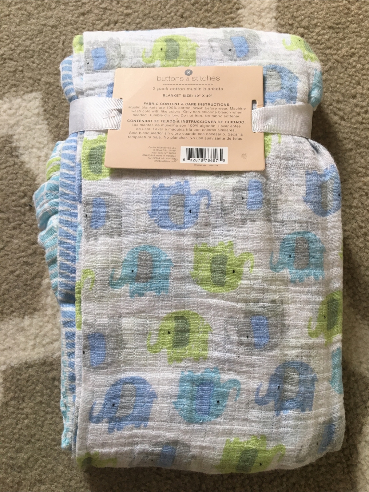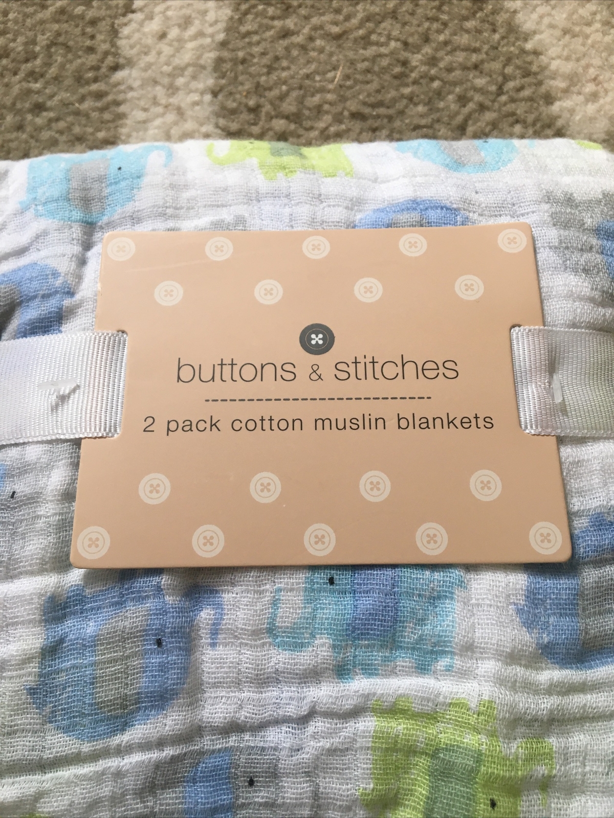 Baby NWT 2 Pack Cotton Muslin Blankets Elephant Buttons Stitches Free Shipping