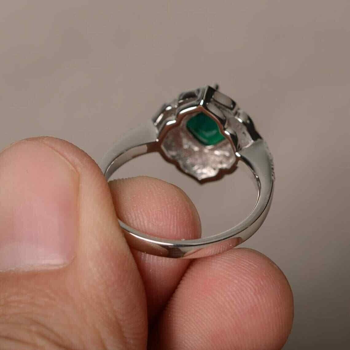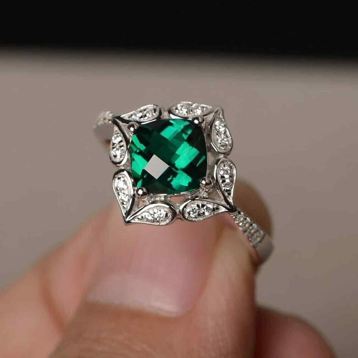 как выглядит 2.00Ct Cushion Cut Simulated Green Emerald Engagement Ring 14K White Gold Plated фото