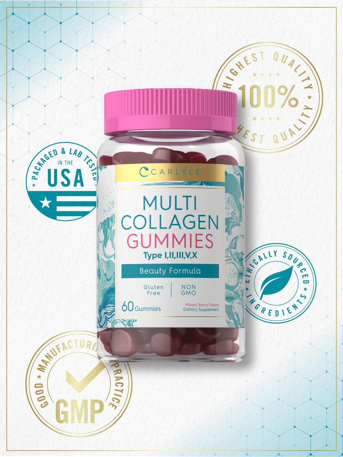 Collagen Gummies 60 Count Multi Collagen Complex Berry Flavor by Carlyle