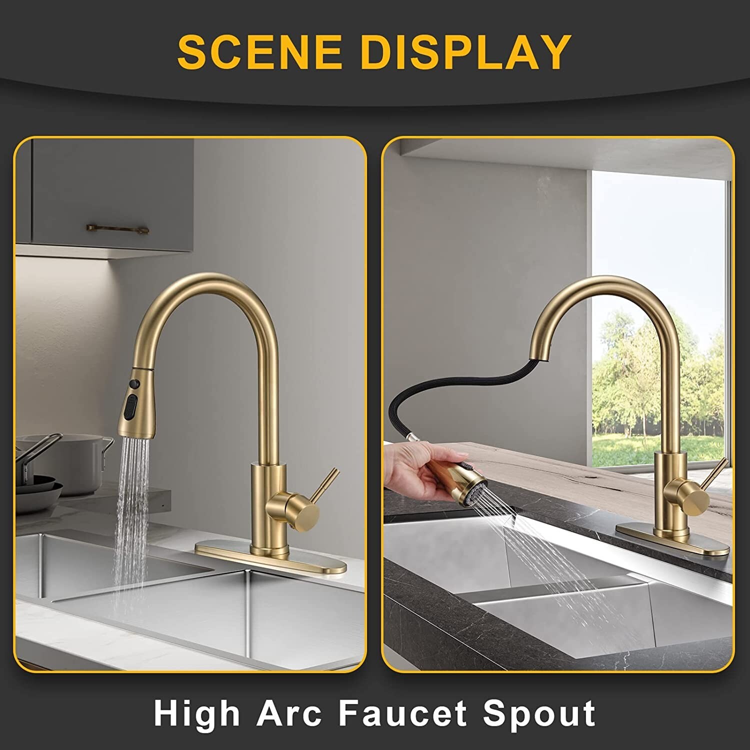 Brushed Gold Kitchen Sink Faucet with Pull Down Sprayer 3Hole Mounted Mixer
