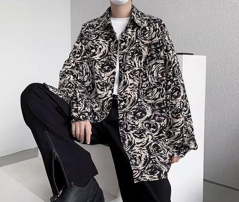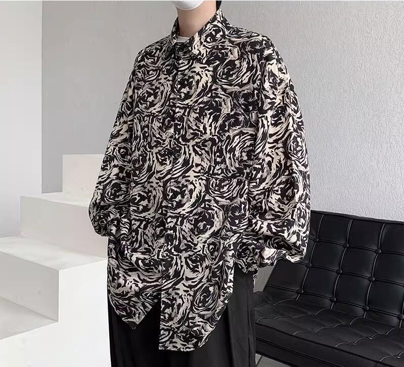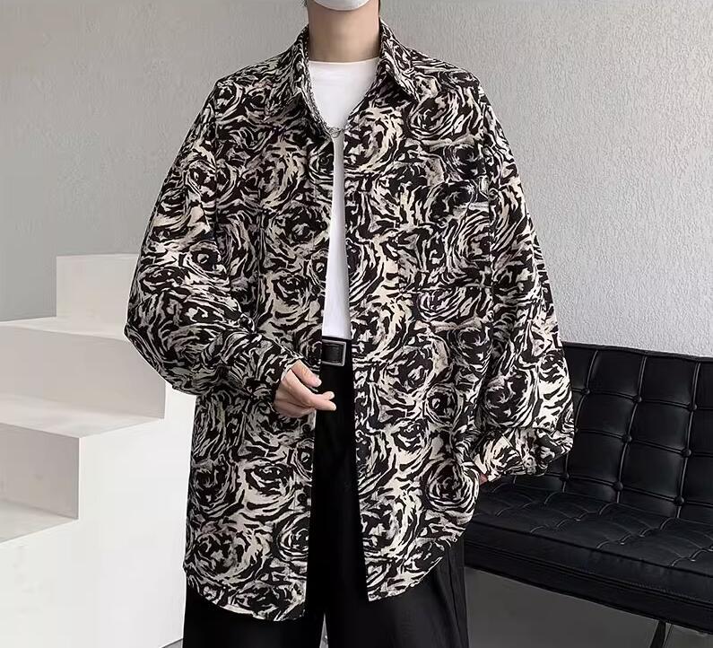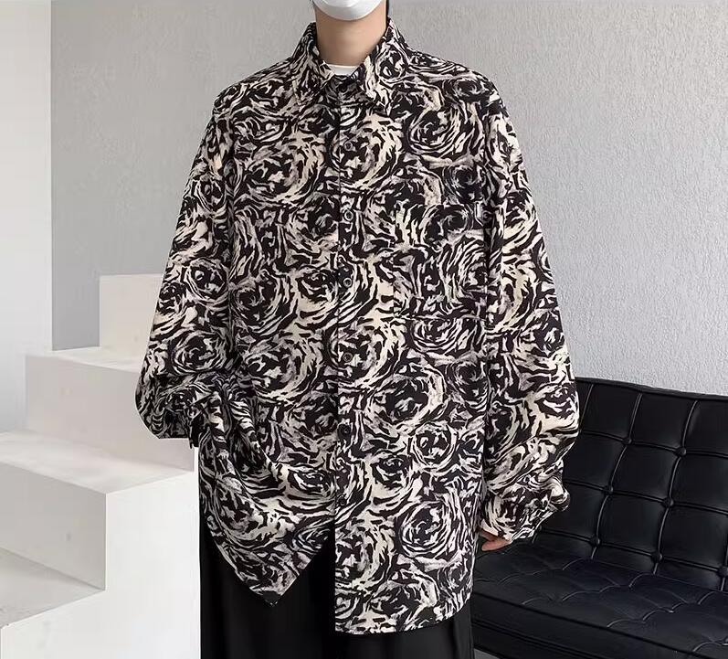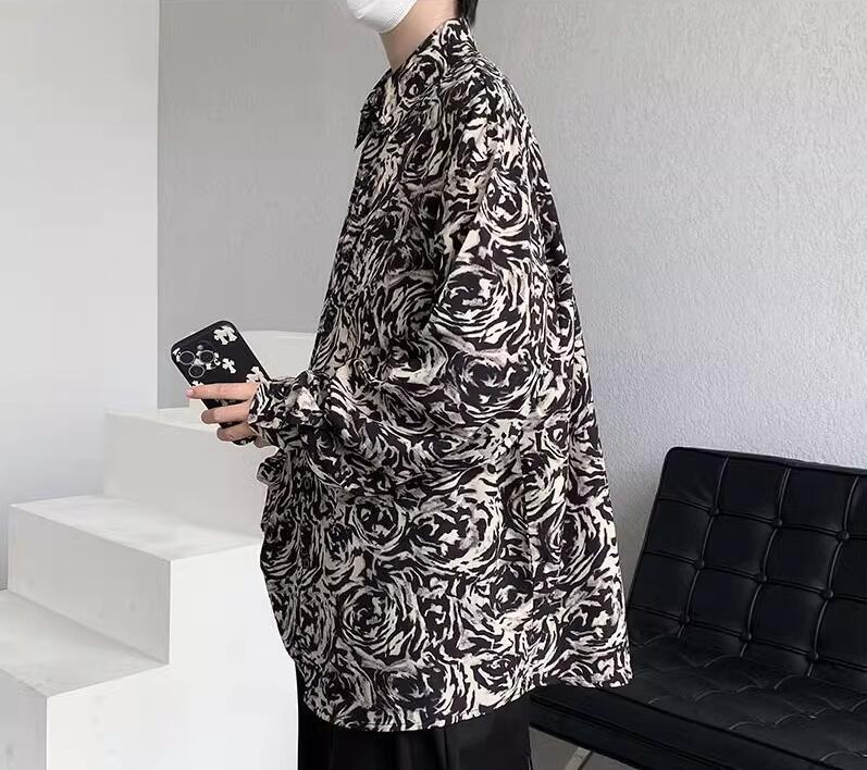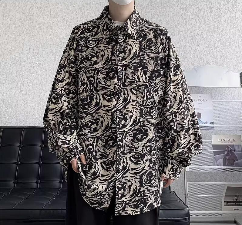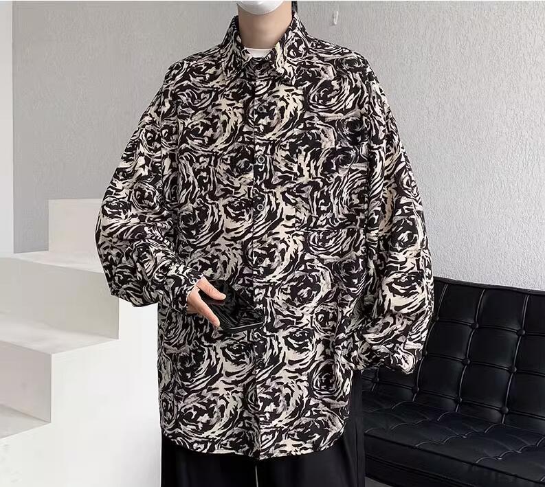 Mens Fashion Retro Lapel Long Sleeve Loose Printed Shirt Youth Casual Beach Top