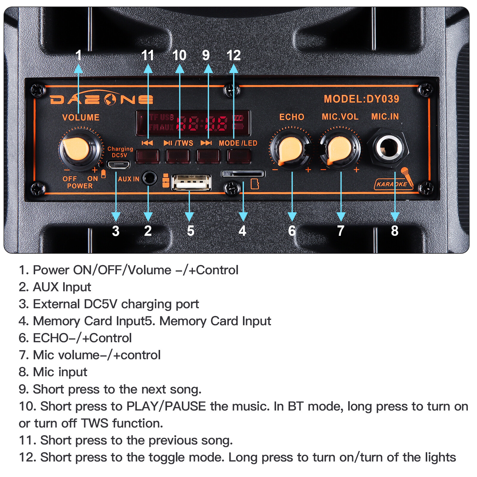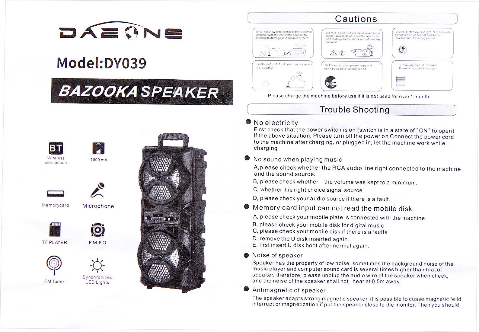 Audio Inputs: USB, FM, AUX, Bluetooth, MemoryCard, MP3