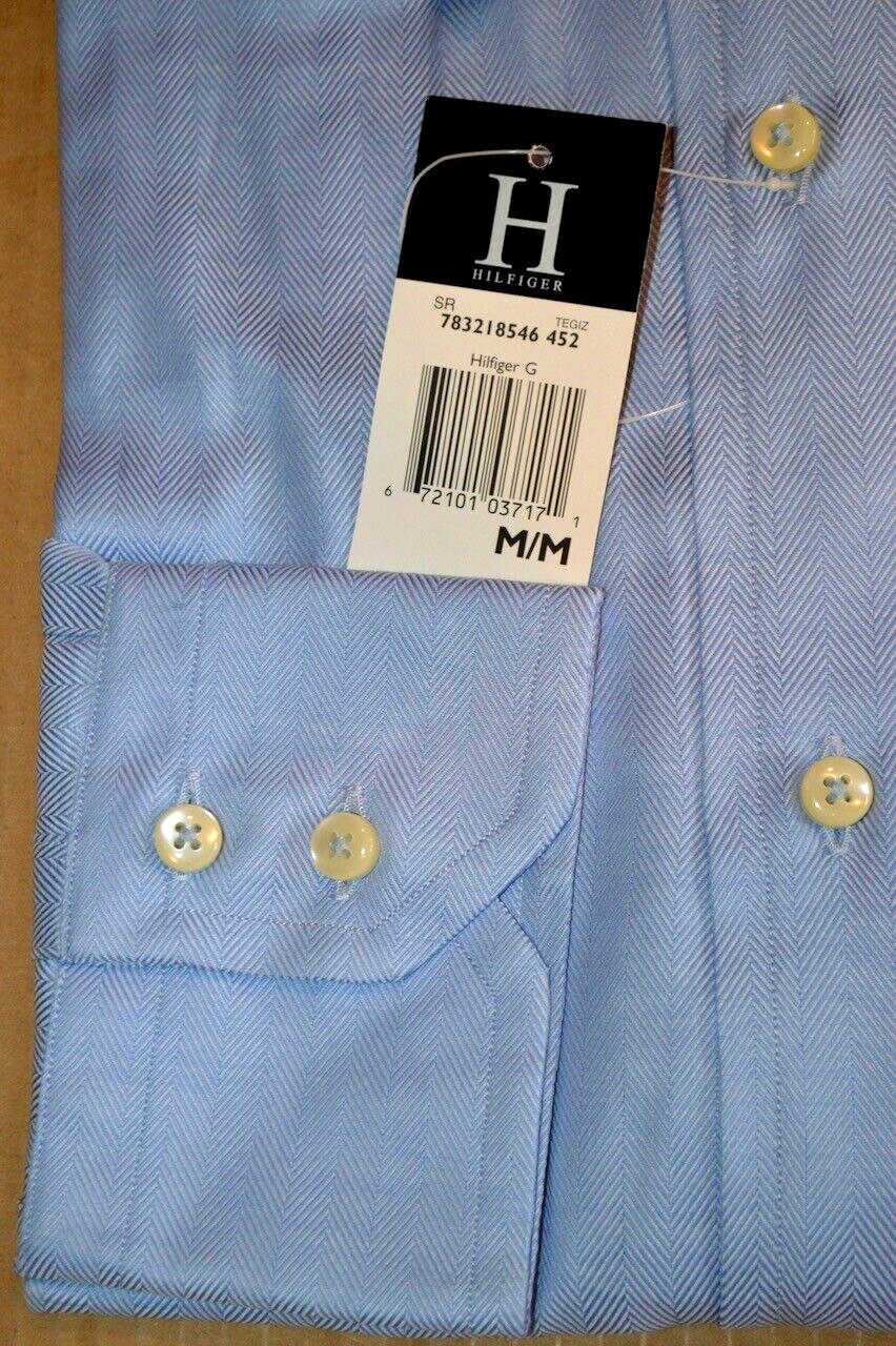 125 NWT H By HILFIGER Blue herringbone point collar M cotton dress shirt men's