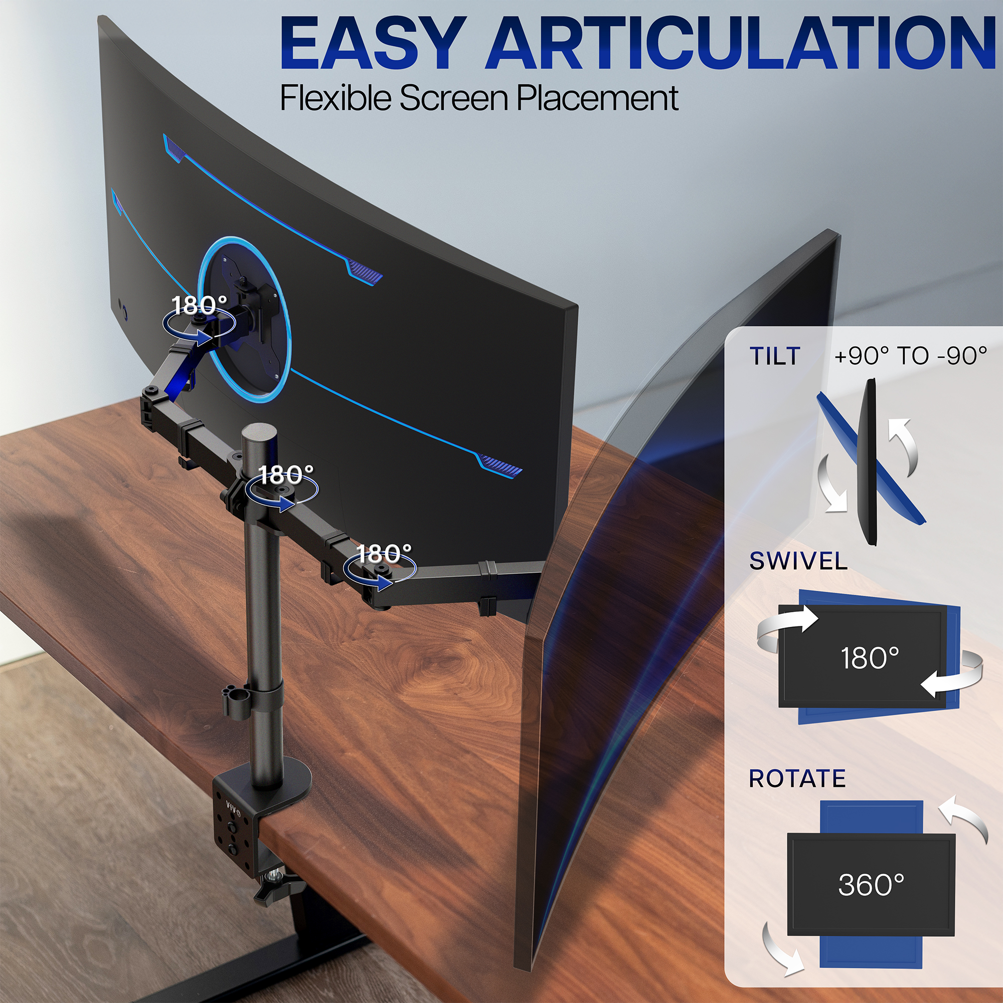 Особенности: Height Adjustable along center pole, Articulation: +90° to -90° tilt, 180° swivel, and 360° rotation