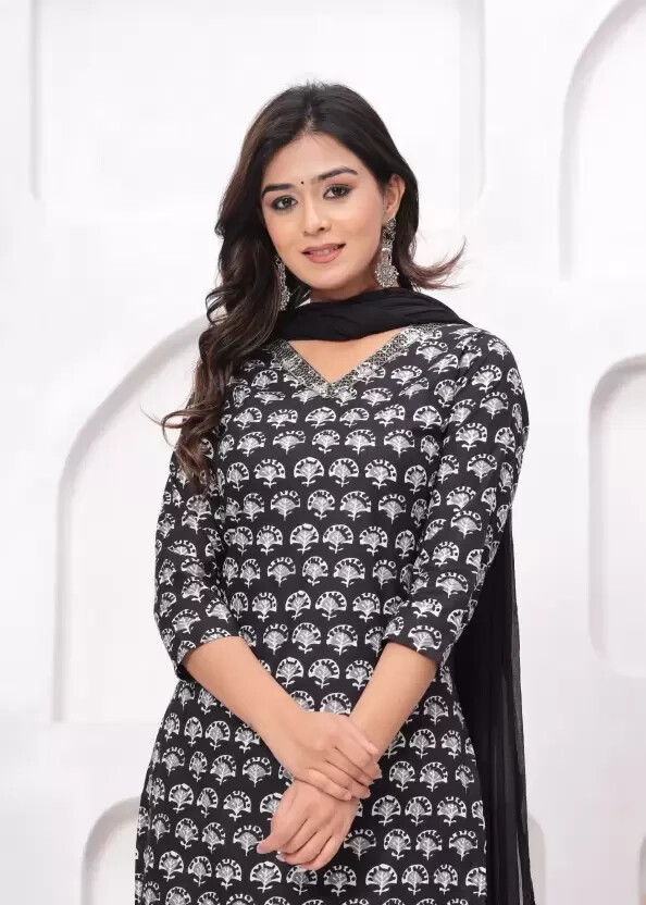 как выглядит Premium New Womens Traditional Wear Black Cotton Kurta,Patiala Pant And Dupatta фото