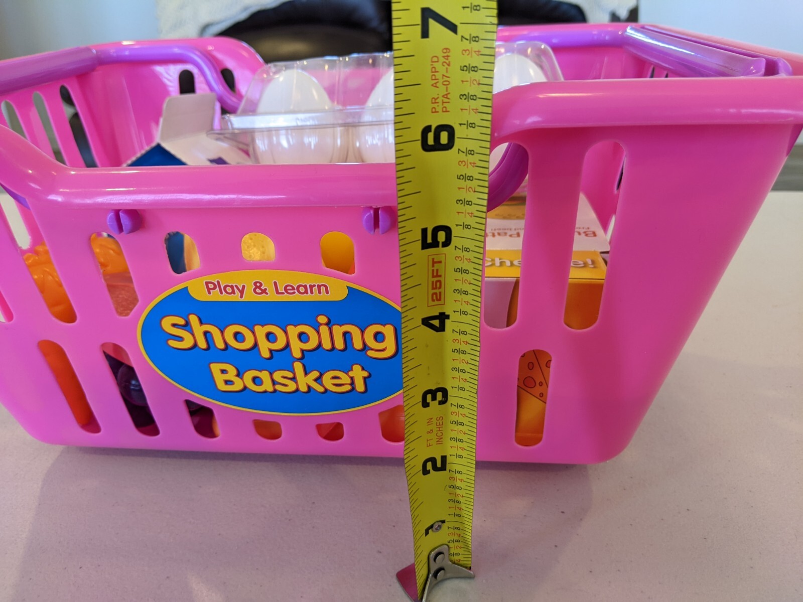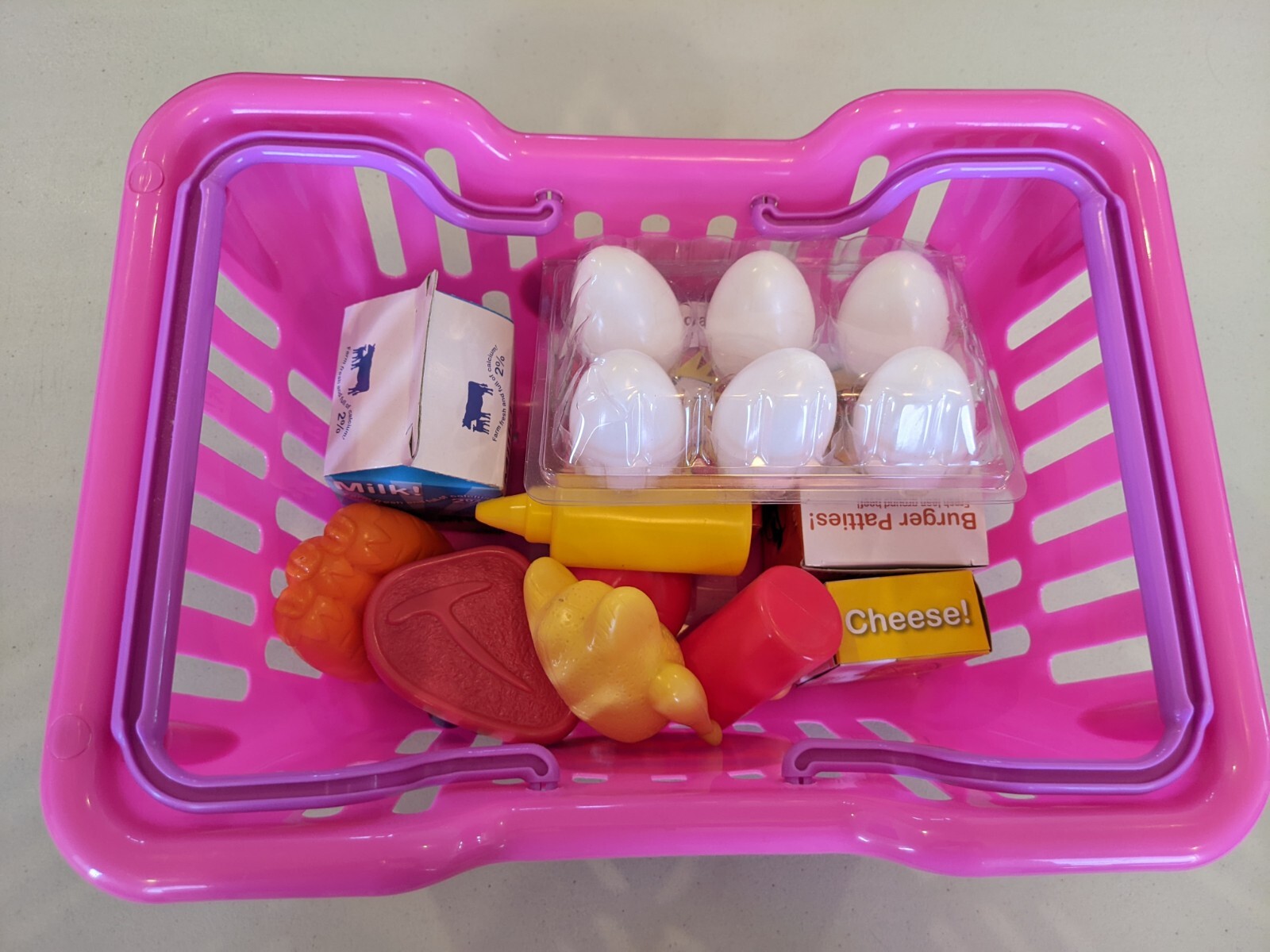 Play Food Shopping Basket And Toy Food Items: Eggs, Milk, Fruit, Meat