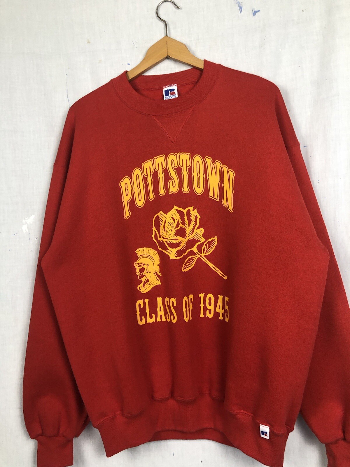 как выглядит 1990s Russell Athletic Pottstown "Class of 1945" red yellow crewneck фото