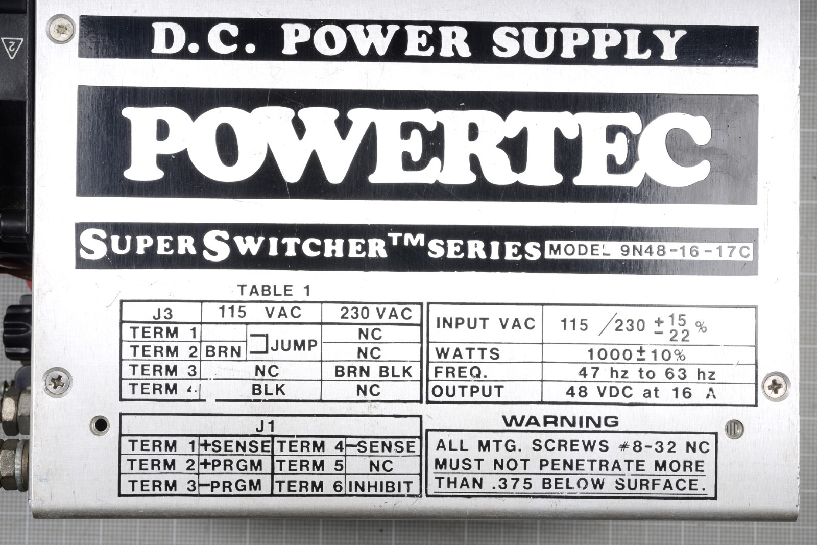 POWERTEC DC POWER SUPPLY - MODEL: 9N48-16-17C. 1000 watt.