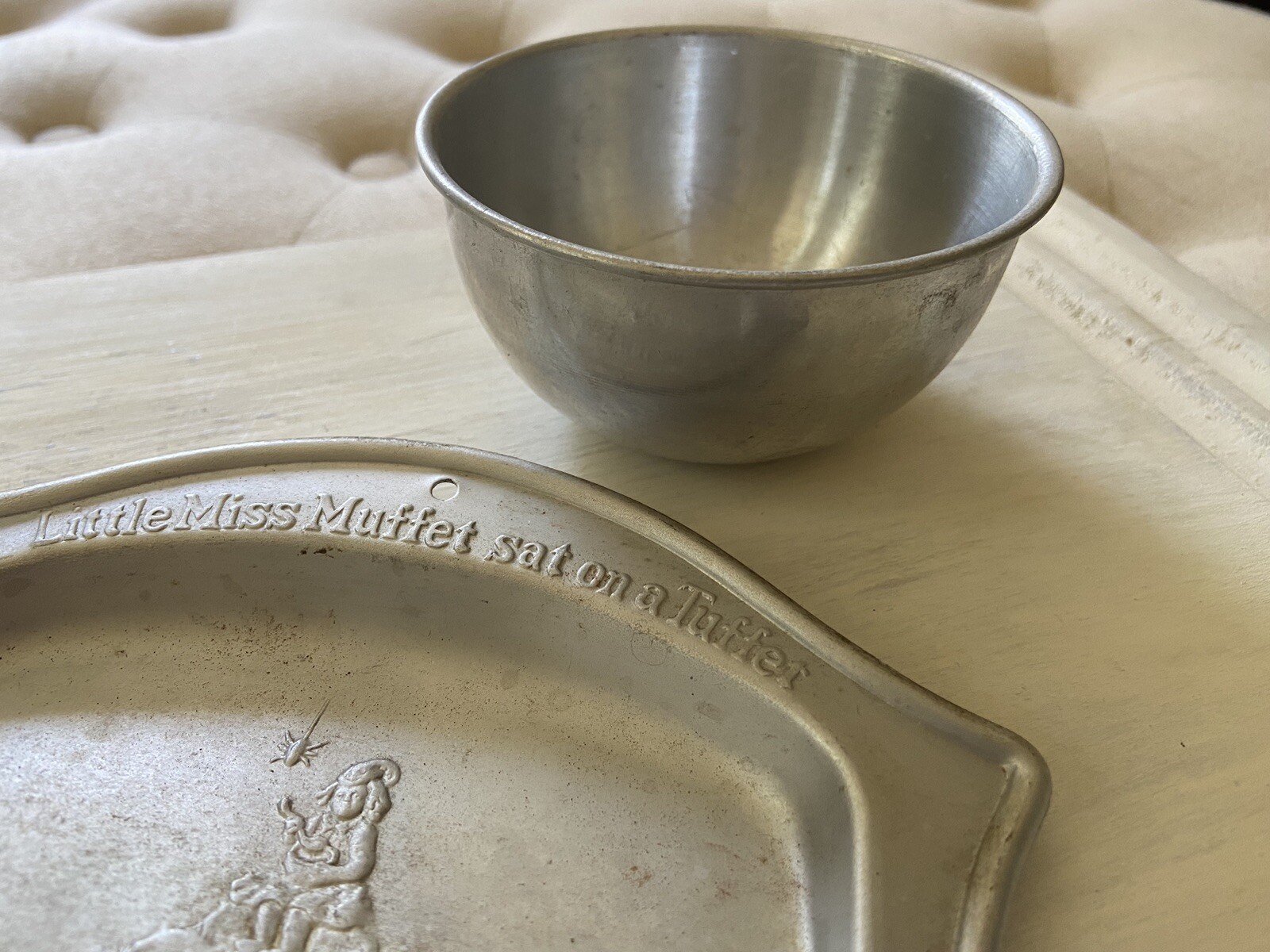 Vintage Aluminum Metal Child Kitchen Play Set Pan, Bundt, Mixing Bowl, Scrapers