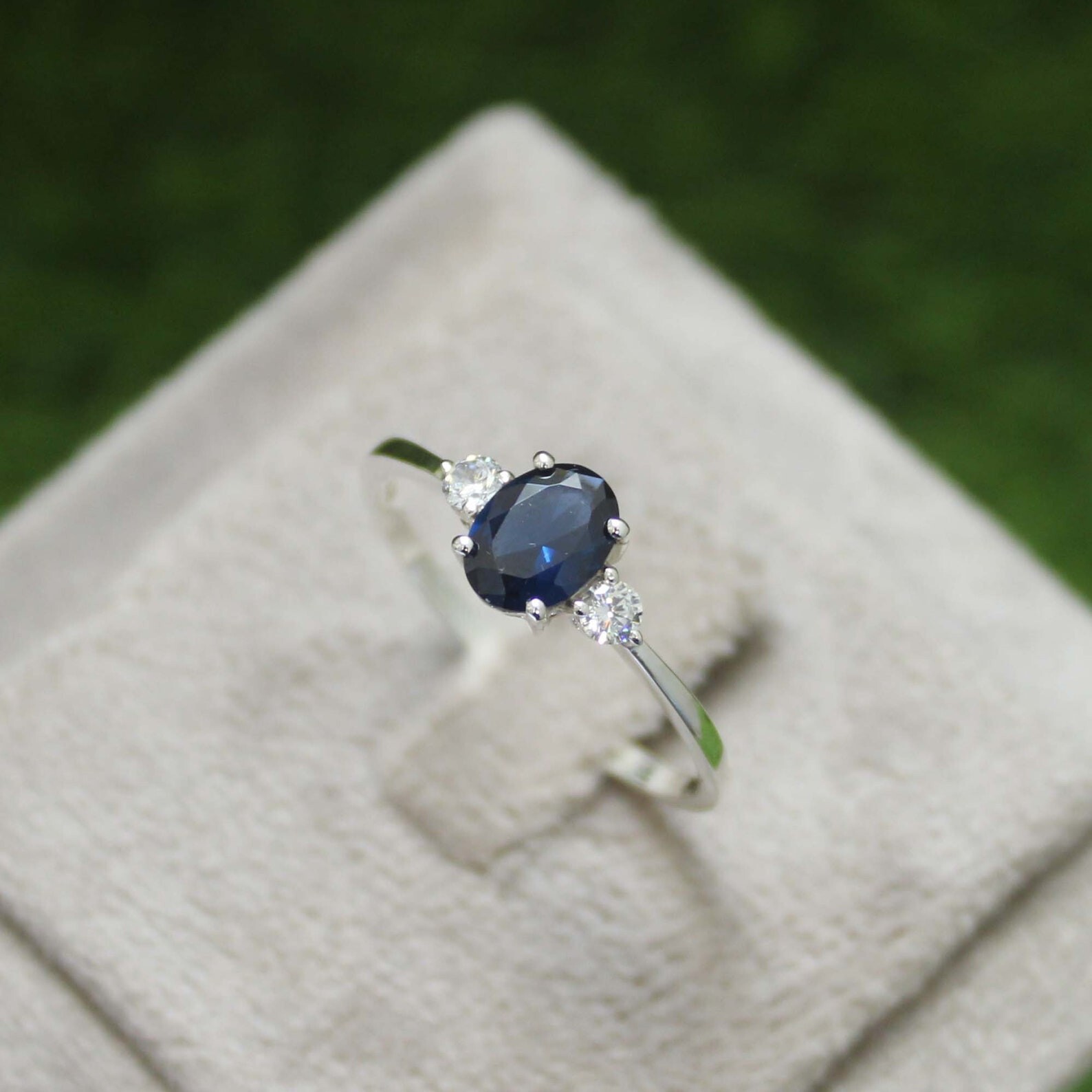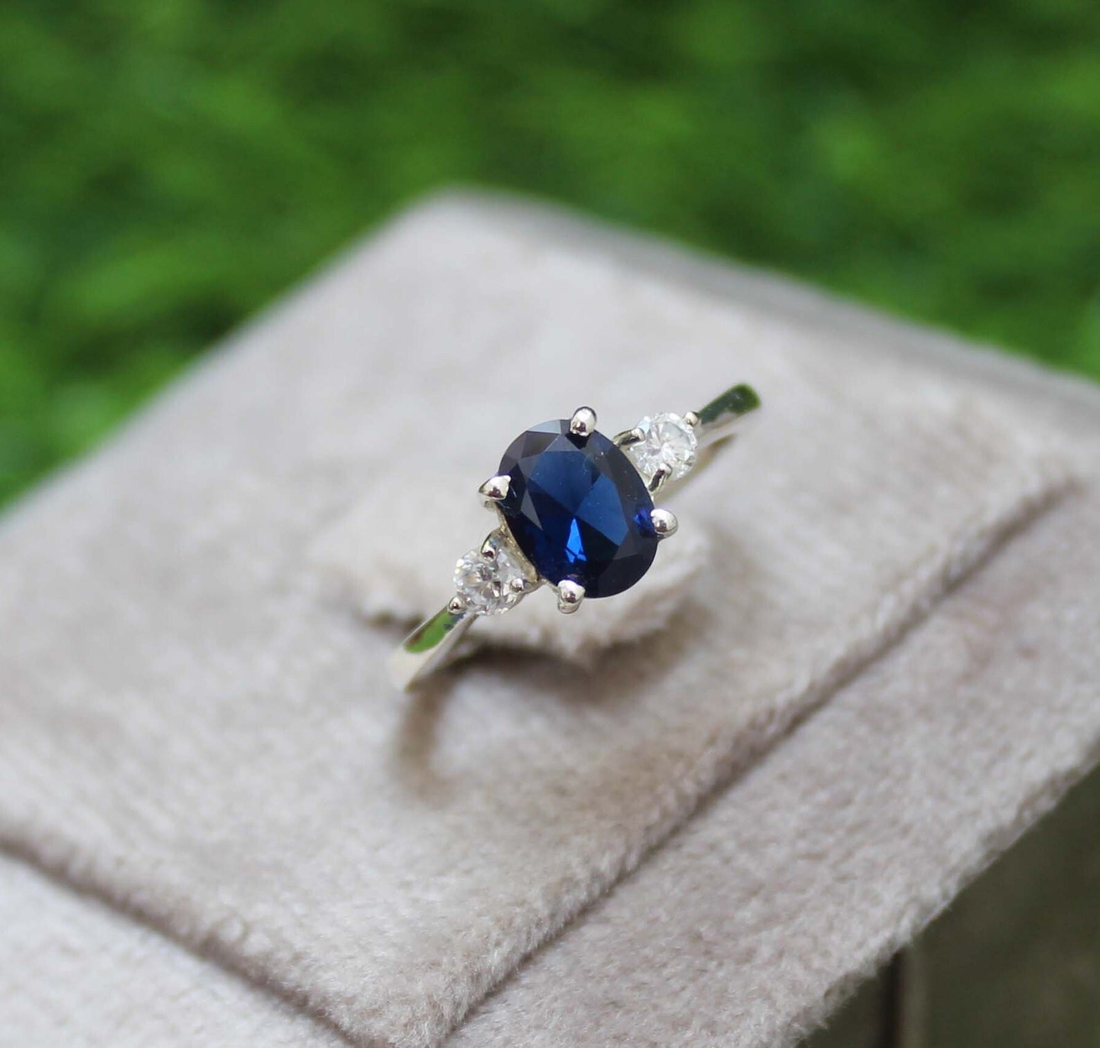 Lab Created Oval Blue Sapphire Ring Sterling Silver Gemstone Engagement Promise