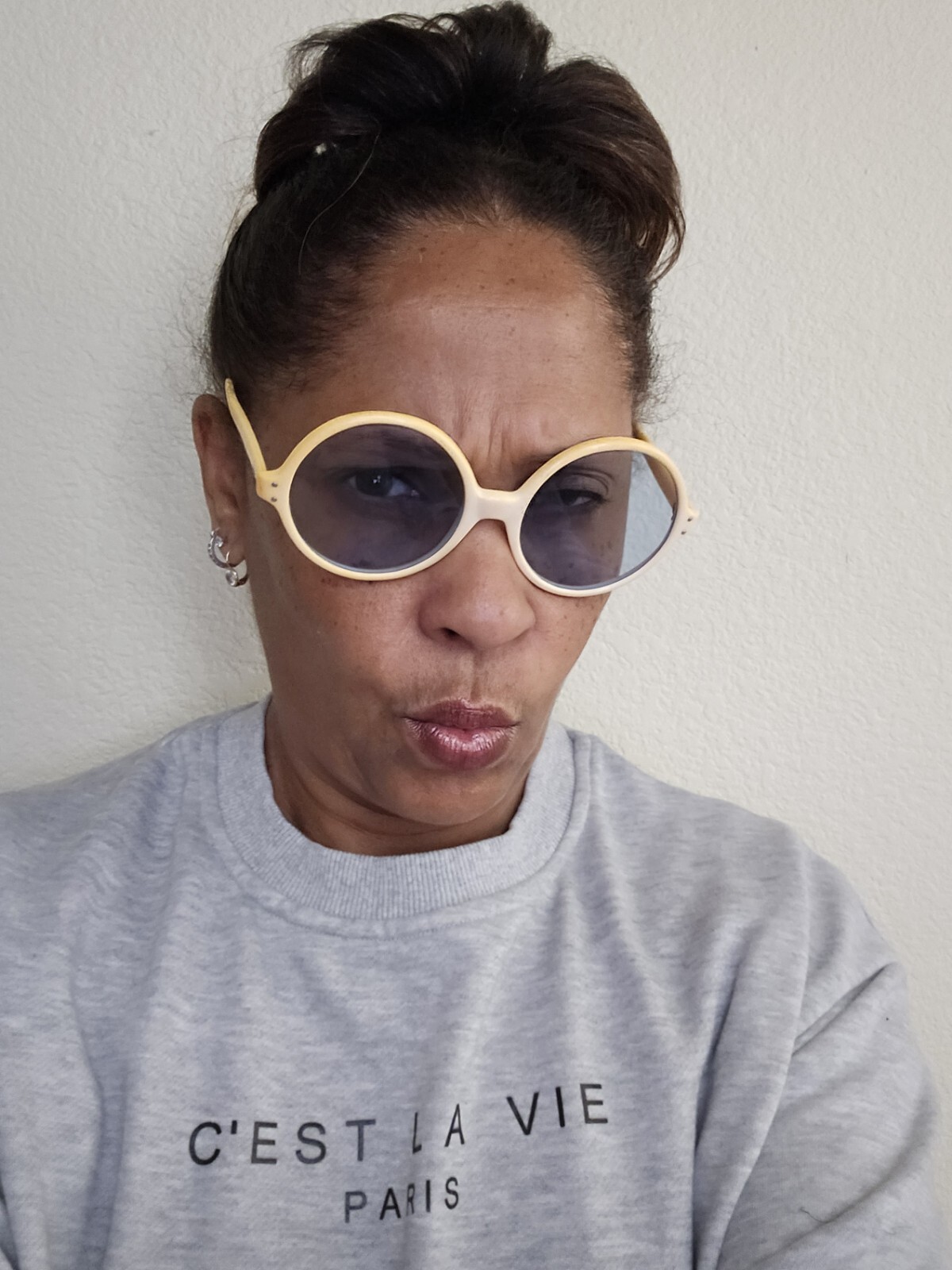 Vintage Round Sunglasses Ambre Cream/Gold Frames Blue Gray Lenses Made In France