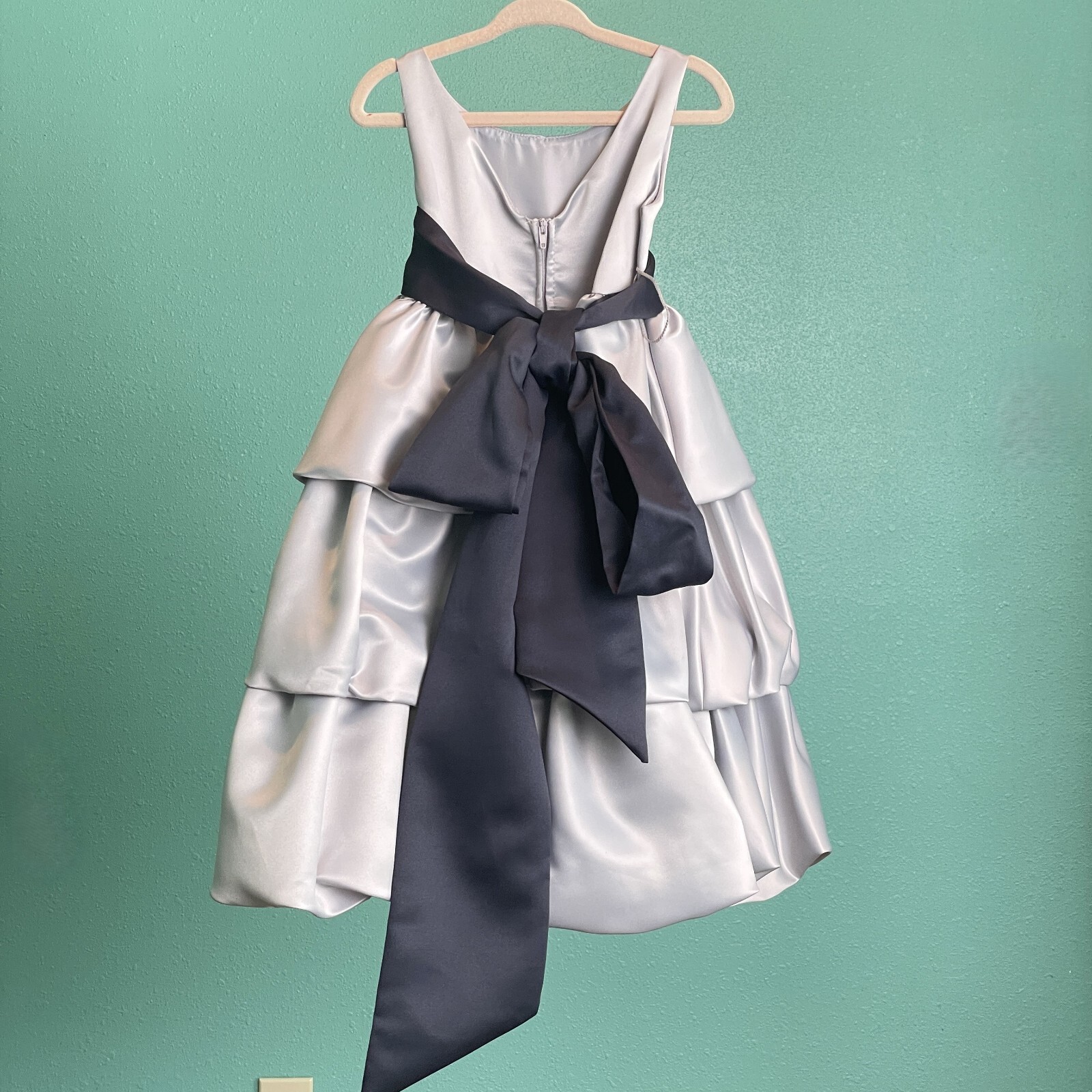 как выглядит New Good Girl Satin Dress Size 2 in Silver with Navy Sash фото