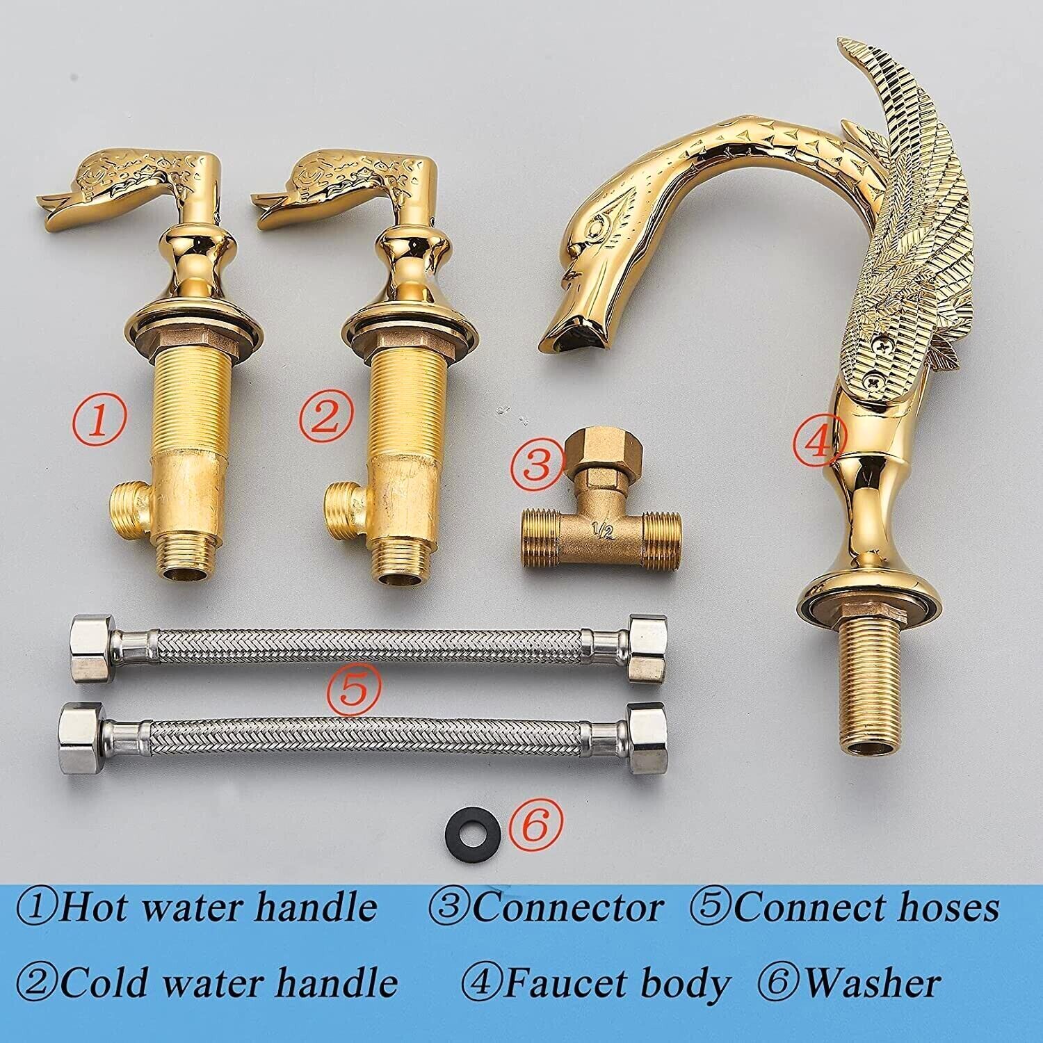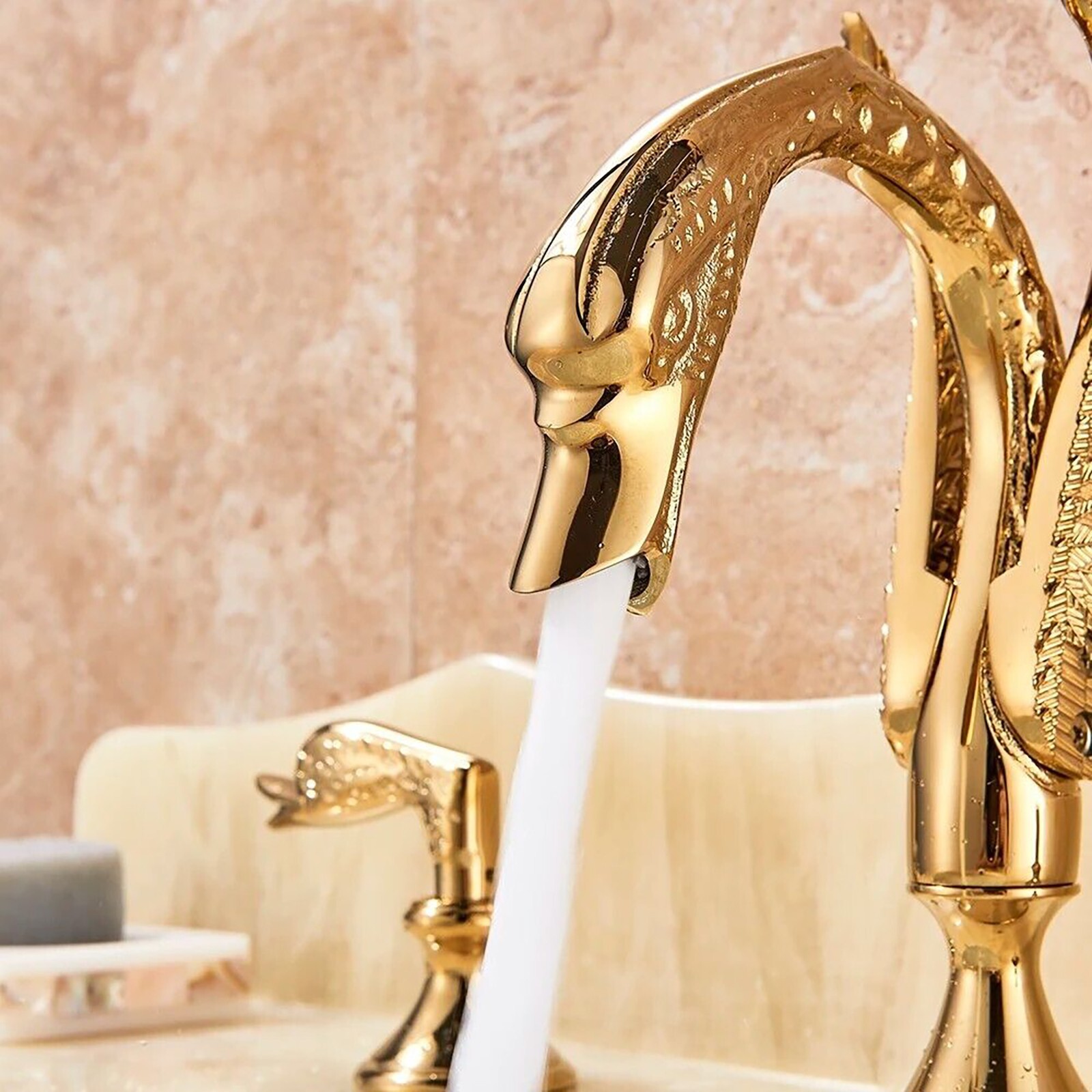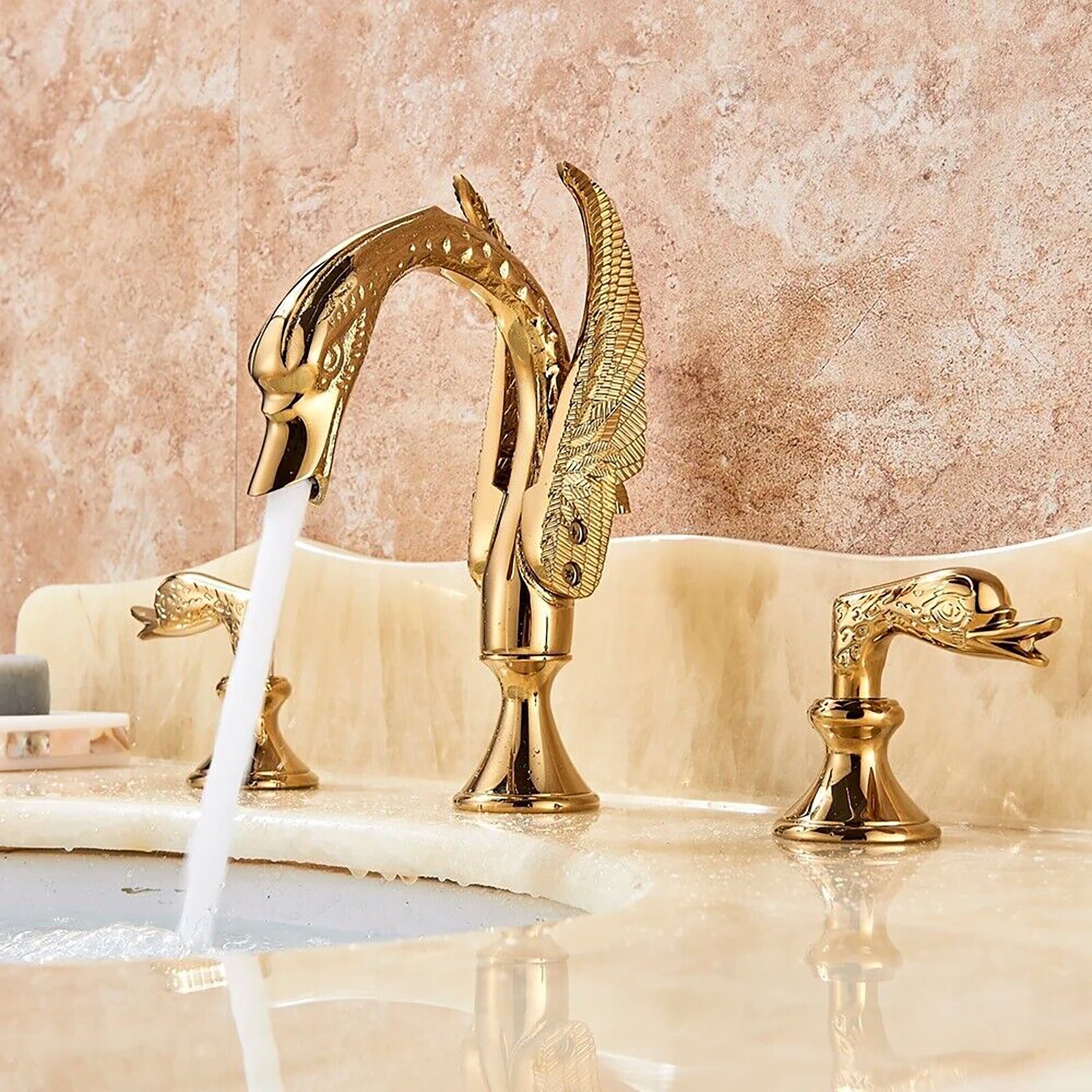 Gold Bathroom Sink Faucet Widespread 3-Holes Swan Vanity Basin Mixer Tap Faucet
