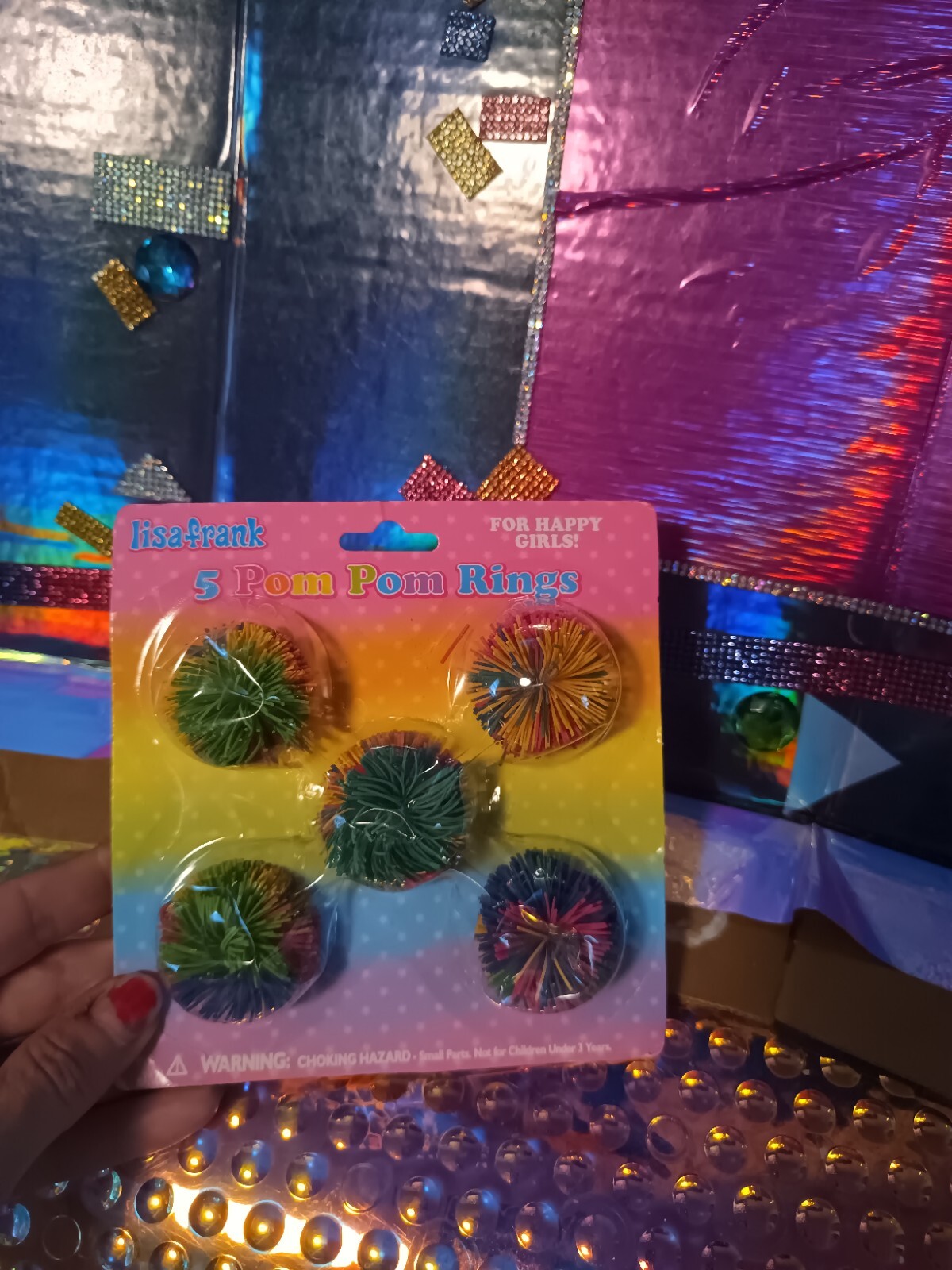 как выглядит Vintage Lisa Frank 5 Pom Pom Rings For Happy Girls Toy in Package 1990s фото