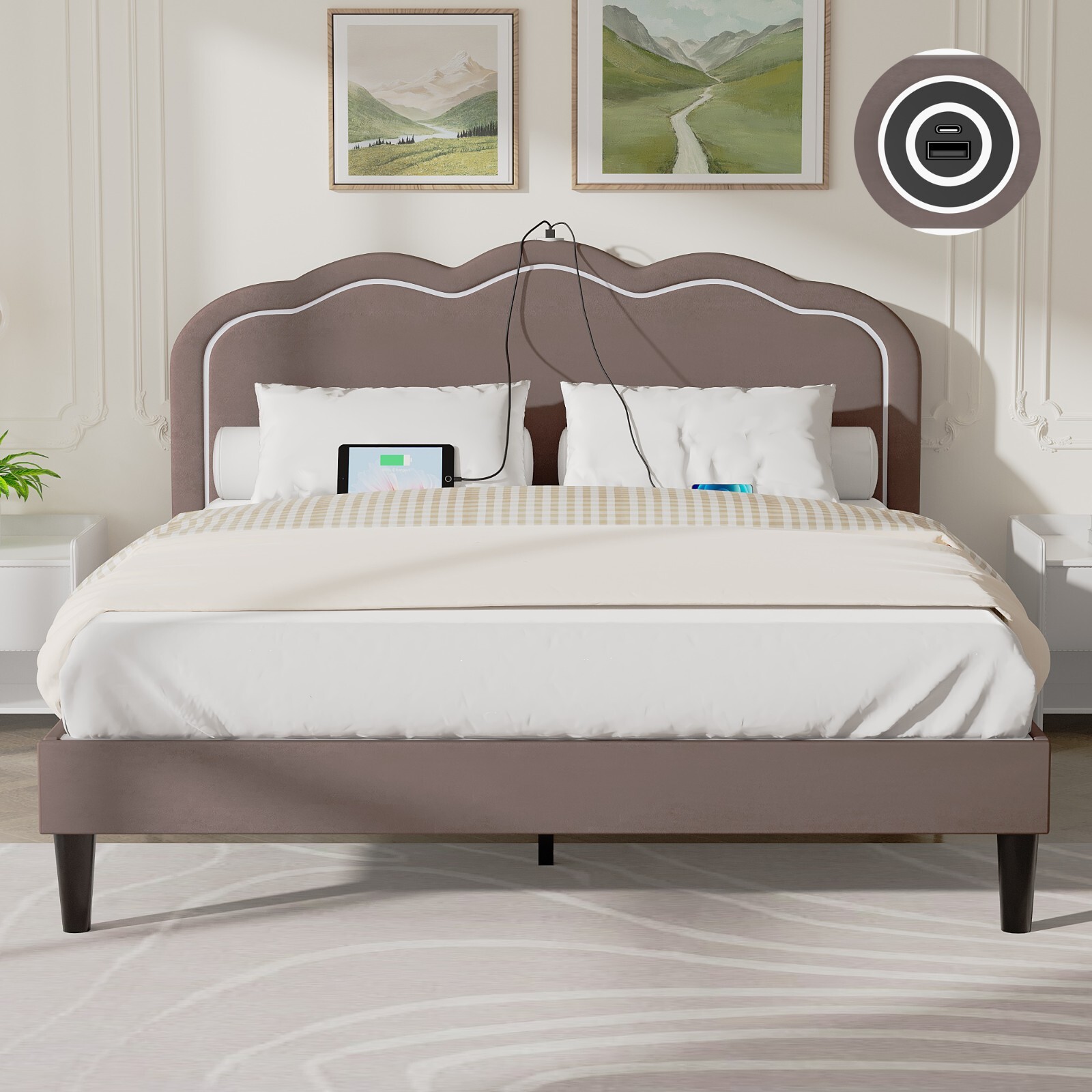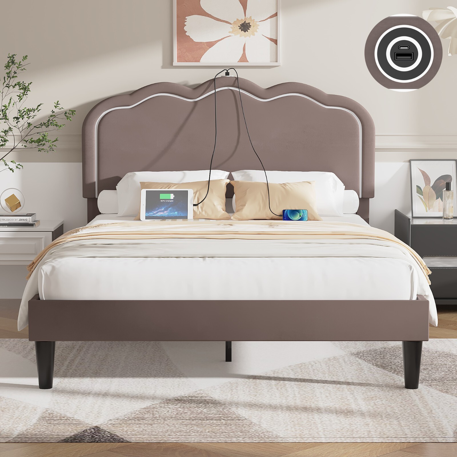 Twin/Full/Queen Bed Frame with Upholstered Headboard LED Lights Charging Station