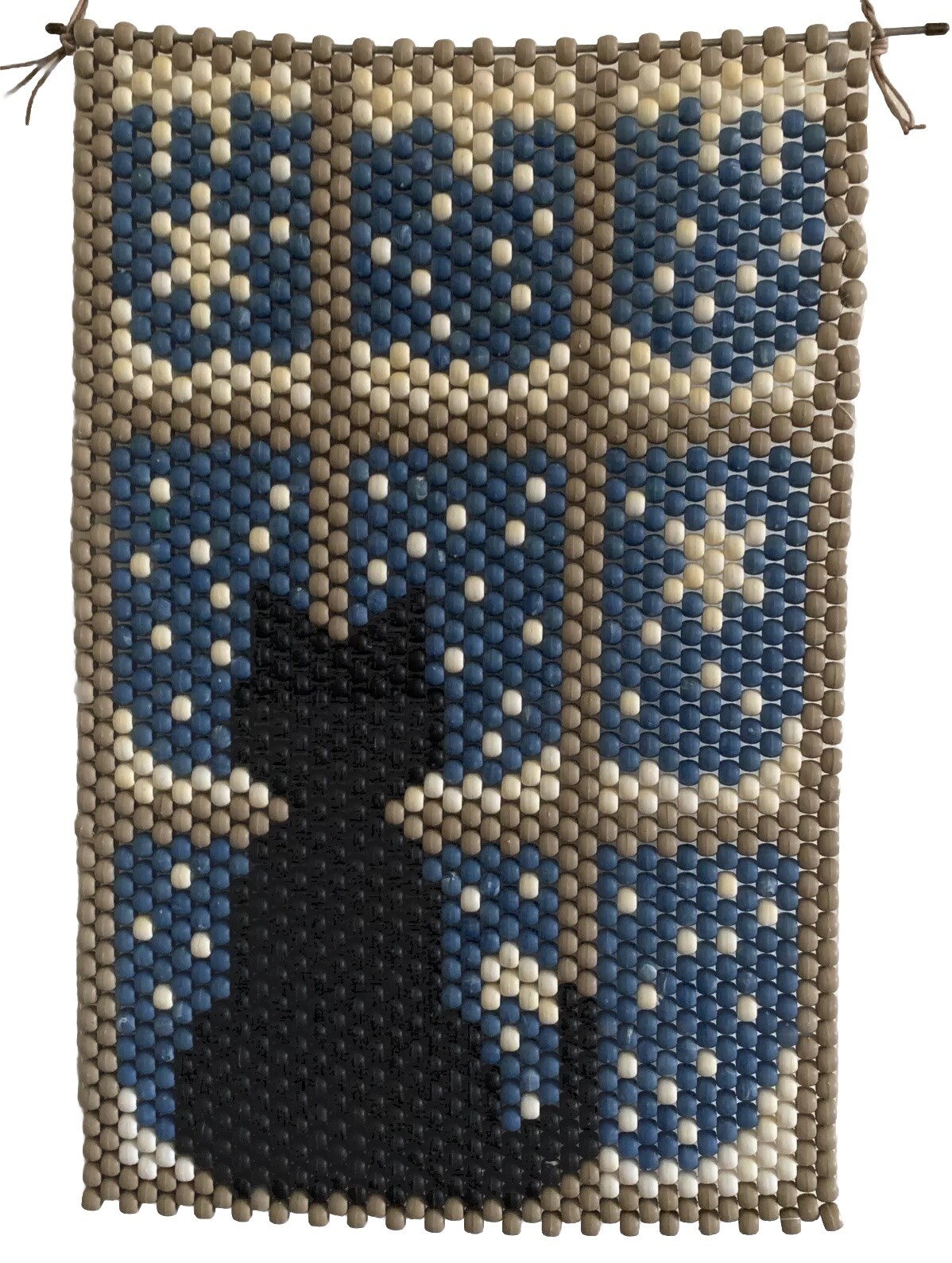 как выглядит Vintage Beaded Cat In The Window Complete Wall Hanging Banner Snowy Winter Scene фото