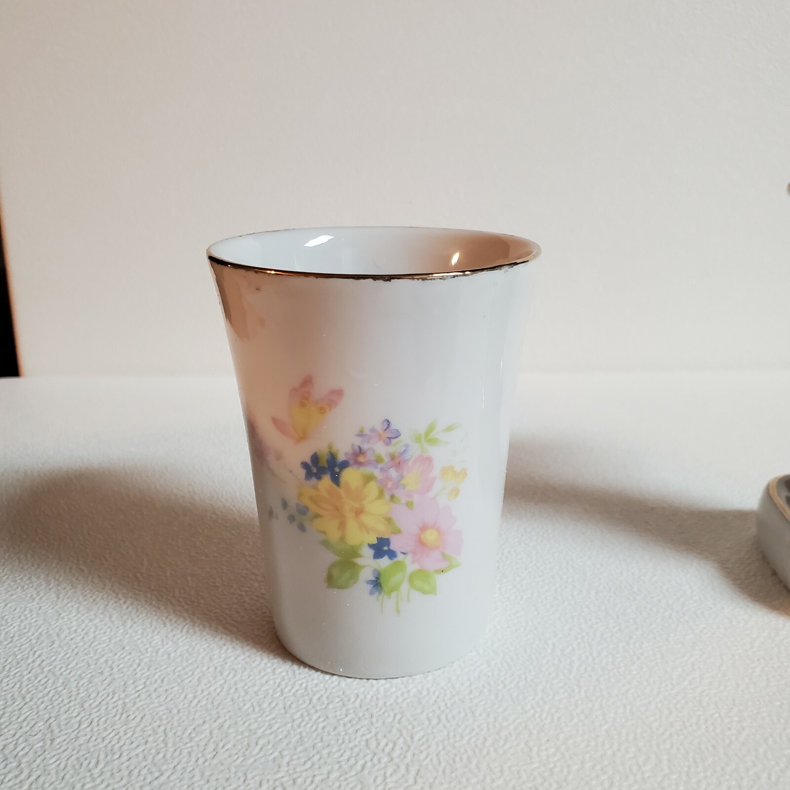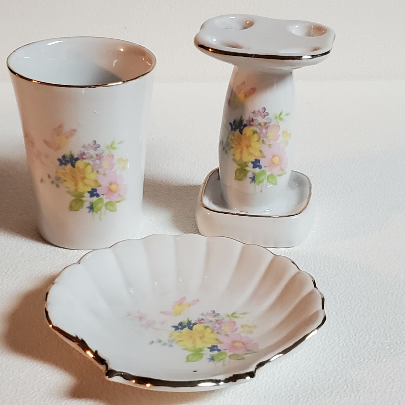 • Porcelain Bathroom Vanity Set 3 Piece Floral Toothbrush Cup Soap Dish Taiwan NOS