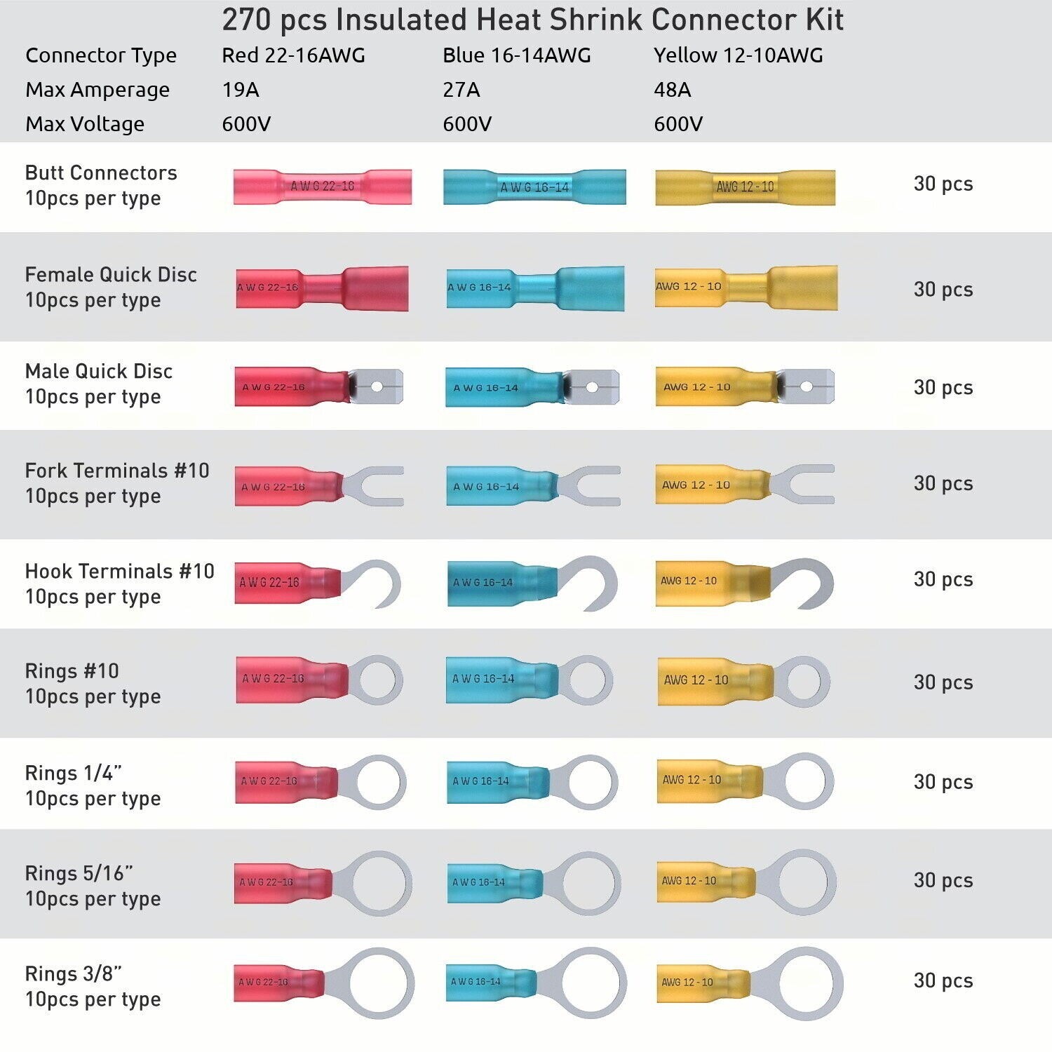 270pcs Heat Shrink Tubing Wire Connectors Marine Automotive Waterproof Terminal