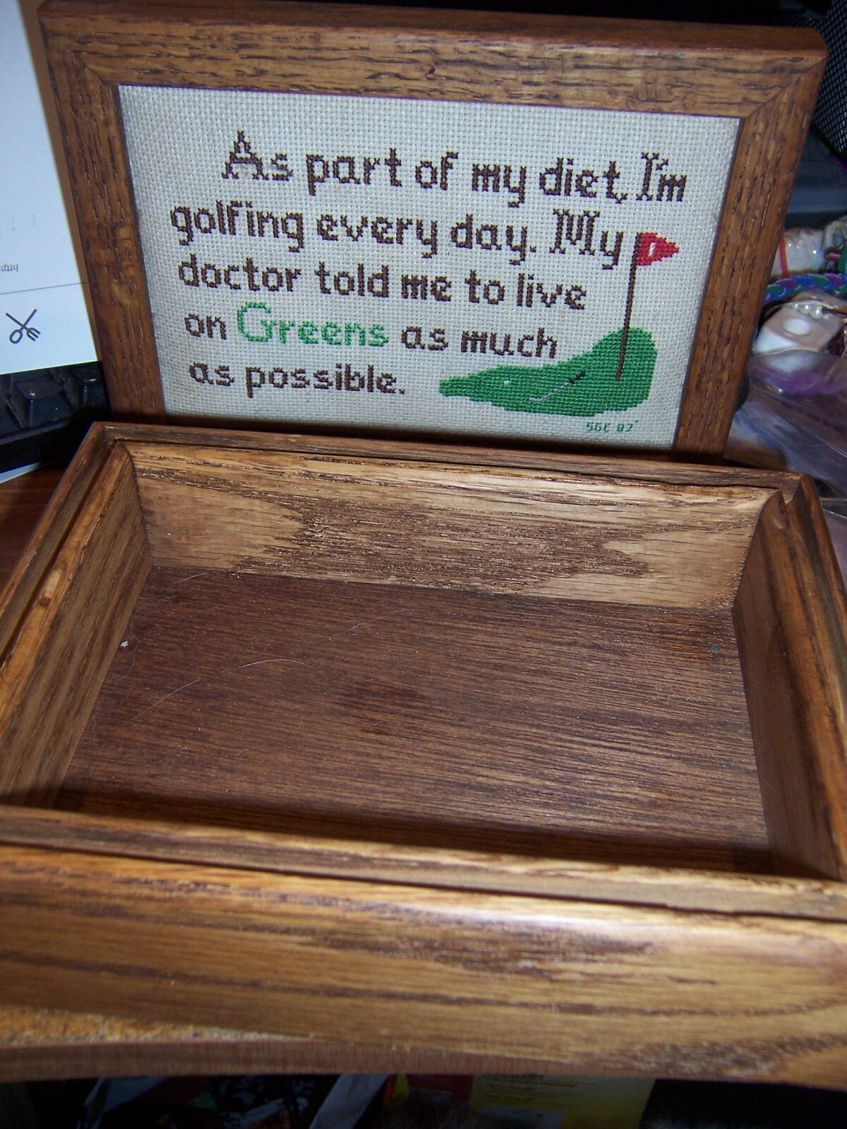 HANDMADE WOODEN BOX WITH NEEDLEPOINT LID - GOLF MOTIF