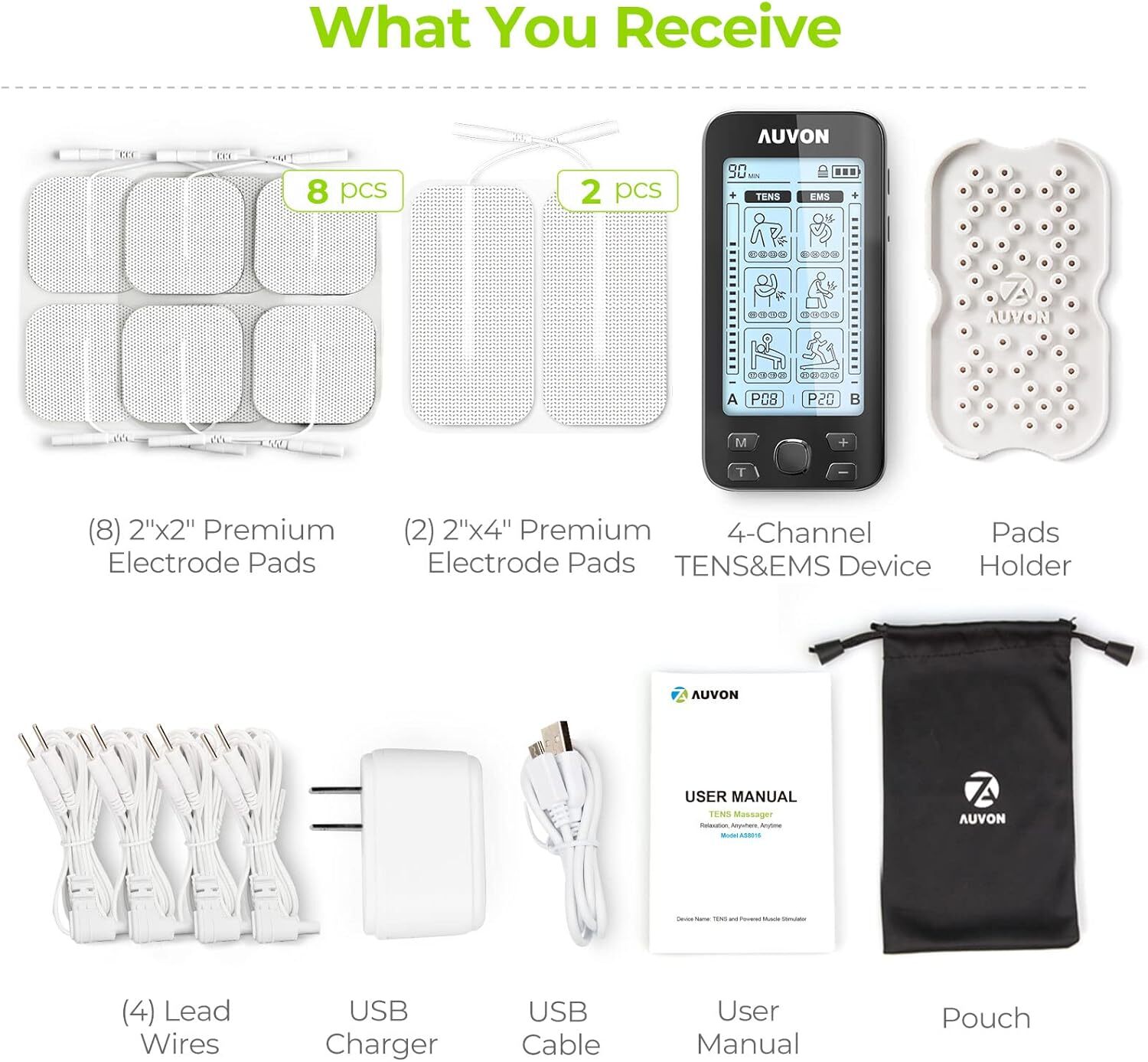 AUVON 4 Outputs TENS Unit EMS Muscle Stimulator Machine for Pain Relief Thera...